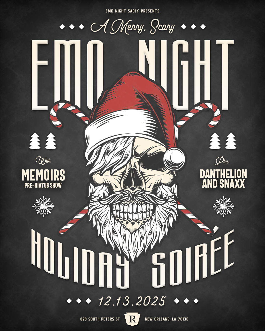 There's no place like home for the holidays, and by HOME, we mean REPUBLIC for EMO NIGHT, because let's keep it real, you've never felt like you belonged anyway... Your brother is probably a lawyer and your parents are so proud, but what have you done? NOTHING. How's that Etsy shop doing? You're probably still working your way up the chain to be an assistant manager at your local Hot Topic... Enough joking around. Emo Night is BACK and this time we're celebrating CHRISTMAS with a libe performance from Memiors and all your favorite emo-singlongs curated by SNAXX + Your Emo NIght host, DAN THE LION!