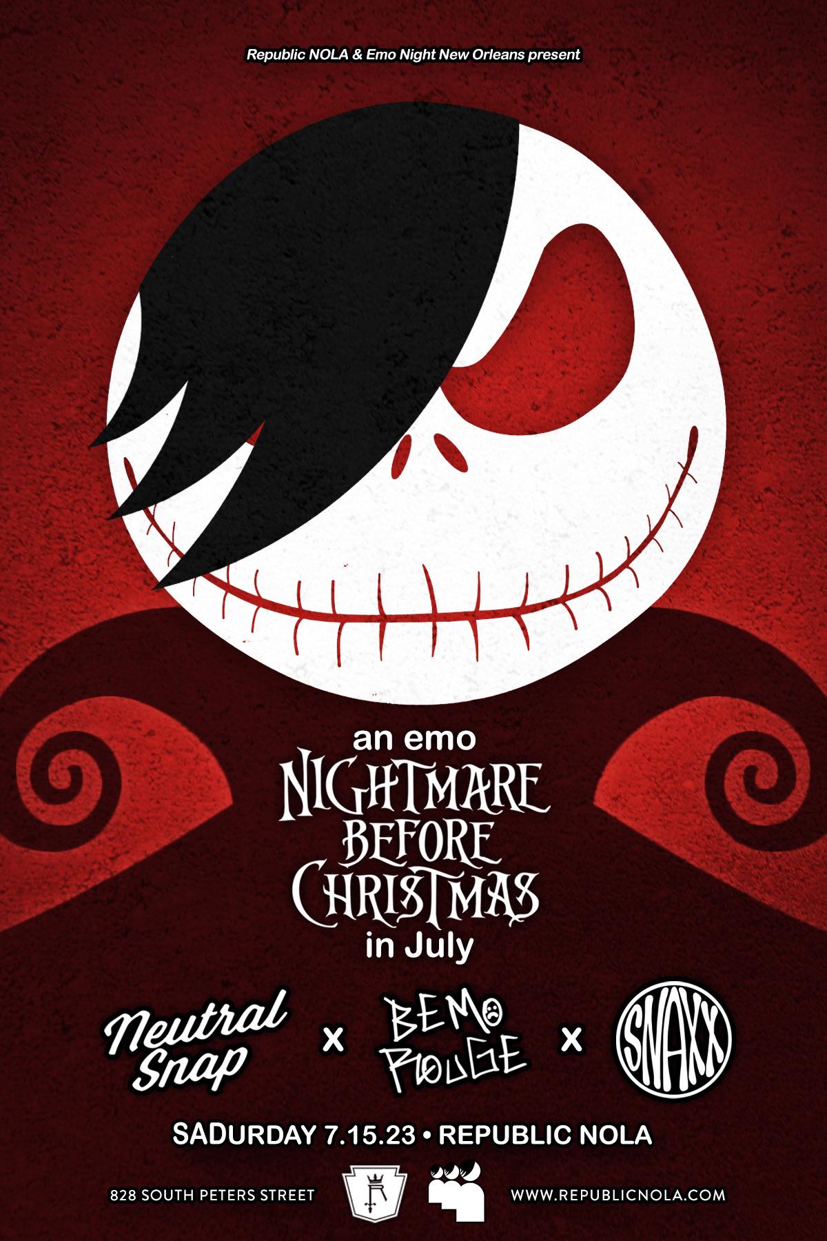 What do you get when you mix Tim Burton with Emo Night in the New Orleans summertime? idk… Probably a cease & desist, but we shall see! Emo Night New Orleans is back July 15th with everyone’s favorite skeleton that you absolutely had plastered over everything you owned in high school. You did, didn’t you? Still think those Jack Skellington slip-on vans were a good idea? Don’t worry. We do too. Our Emo night resident headliner Bemo Rouge, SNAXX, and a live performance from Neutral Snap will be bringing you all the songs you know the words to, because why else would you be here? Why am I still rambling on? You know the drill! Join us for An Emo Night-Mare Before Christmas in July on SADurday 7.15! Get your tickets for $6.66 for a limited time!