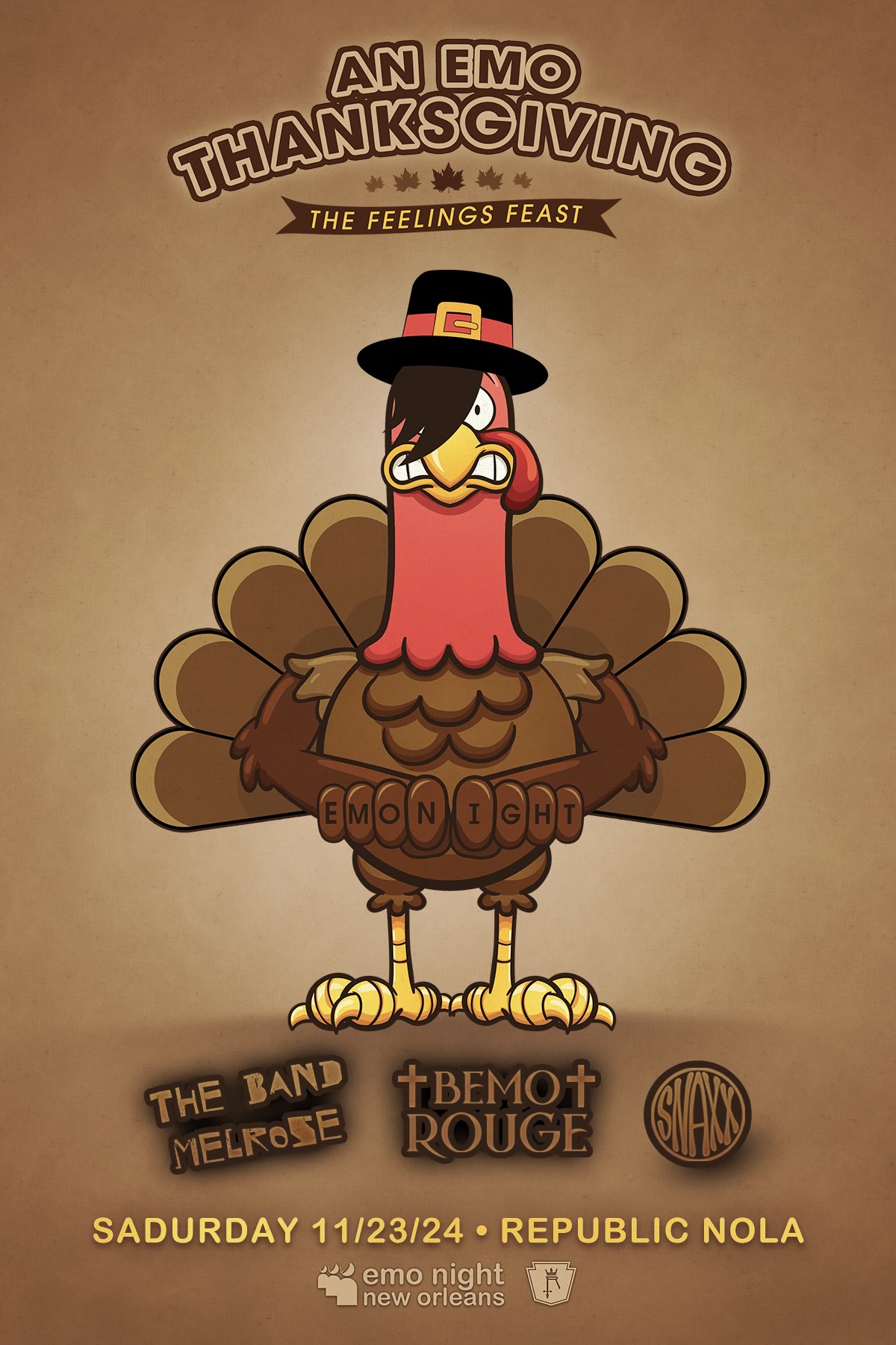 To absolutely no one's surprise, EMO NIGHT IS BACK back for another holiday branded night for absolutely NO ONE’S favorite Holiday, Thanksgiving... Forget about all of your family drama this year and come get a full serving of feelings served up with a live set from The Band Melrose + more helpings [DJ sets] from your Emo King Bemo Rouge + Queen SNAXX! Just stuff yourself full of emotions and keep showing the world that it was never just a phase on Saturday 11.23! Get your tickets NOW!