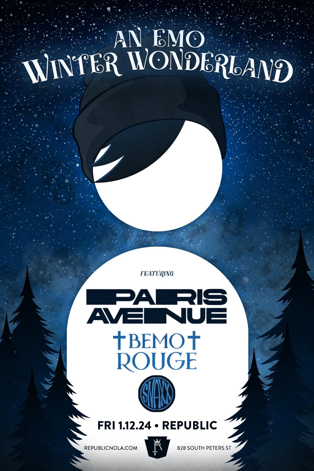 AND WE'RE BACK to our regularly scheduled monthly after the surprise NYEmo show... Join us for An Emo Winter Wonderland featuring Paris Avenue + your emo King [Bemo Rouge] and Queen [DJ SNAXX] on FRIDAY 1.12.14!!! It's a night as cold as your little black hearts... get your tickets NOW for only $6.66 because... IT WAS NEVER JUST A PHASE!!