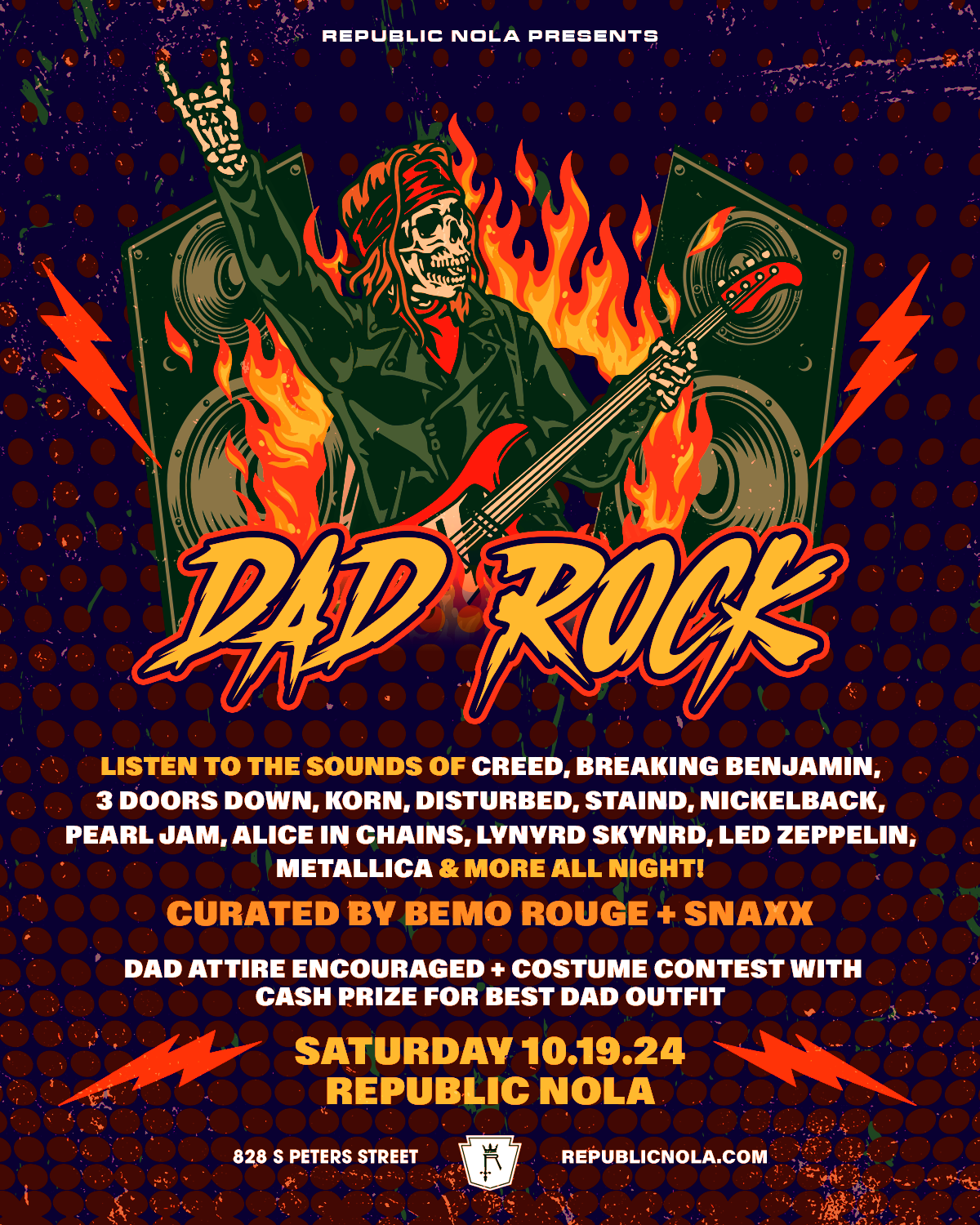 Grab your jorts and your New Balances -- It's time to jam out to DAD ROCK all night curated by Bemo Rouge & SNAXX on Saturday 10.19! Hear the sounds of Creed, Breaking Benjamin, 3 Doors Down, Korn, Disturbed, Staind, Nickelback, Pearl Jam, Alice in Chains, Lynyrd Skynrd, Led Zeppelin, Metallica & MORE! Dad Attire IS ENCOURAGED & there will be a COSTUME CONTEST with a CASH PRIZE for the best Dad! This is a no-brainer... grab your tickets NOW! ?