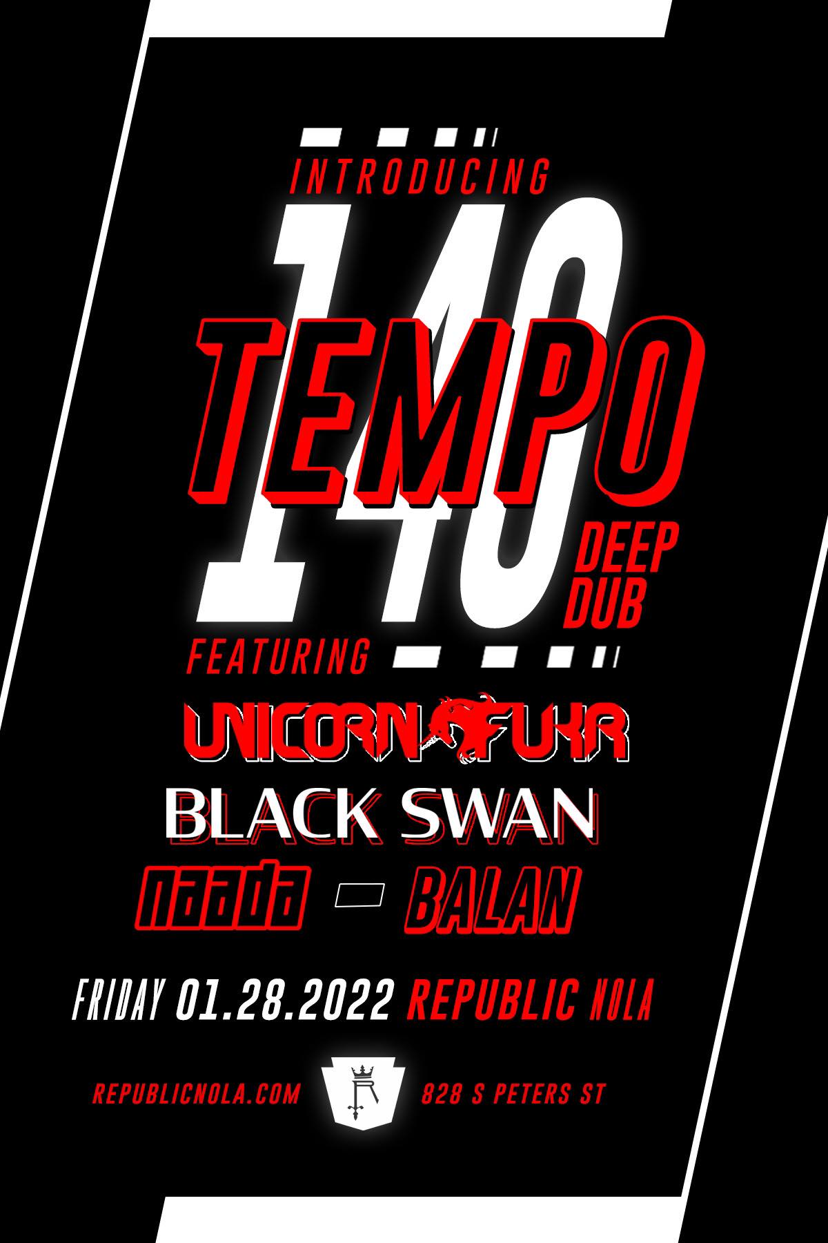 Introducing... TEMPO! Come out for our first installment of our new event series called TEMPO, where we highlight different tempos & genres of electronic music! We're starting off with 140bpm & showcasing Deep Dub with sounds from Unicorn Fukr, Black Swan, naada, and Balan!