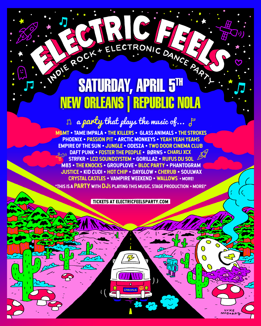 A Party Playing the Music of... Tame Impala • MGMT • The Killers • Miike Snow • Glass Animals • The Strokes • Phoenix • Passion Pit • Arctic Monkeys • Empire of the Sun • Jungle • Vampire Weekend • Peter Bjorn & John • Foster The People • Modest Mouse • alt-J • BØRNS • Toro y Moi • Yeah Yeah Yeahs • Cherub • Gorillaz • The White Stripes • Bloc Party • Future Islands • The Black Keys • Foals • Neon Indian • Electric Guest • STRFKR • Justice • Bag Raiders • The Postal Service • Odesza • CHVRCHES • M83 • The Naked & Famous • Washed Out • LCD Soundsystem • Daft Punk • Ratatat • Hot Chip • Two Door Cinema Club • Friendly Fires • RAC • Weezer • Franz Ferdinand + more!