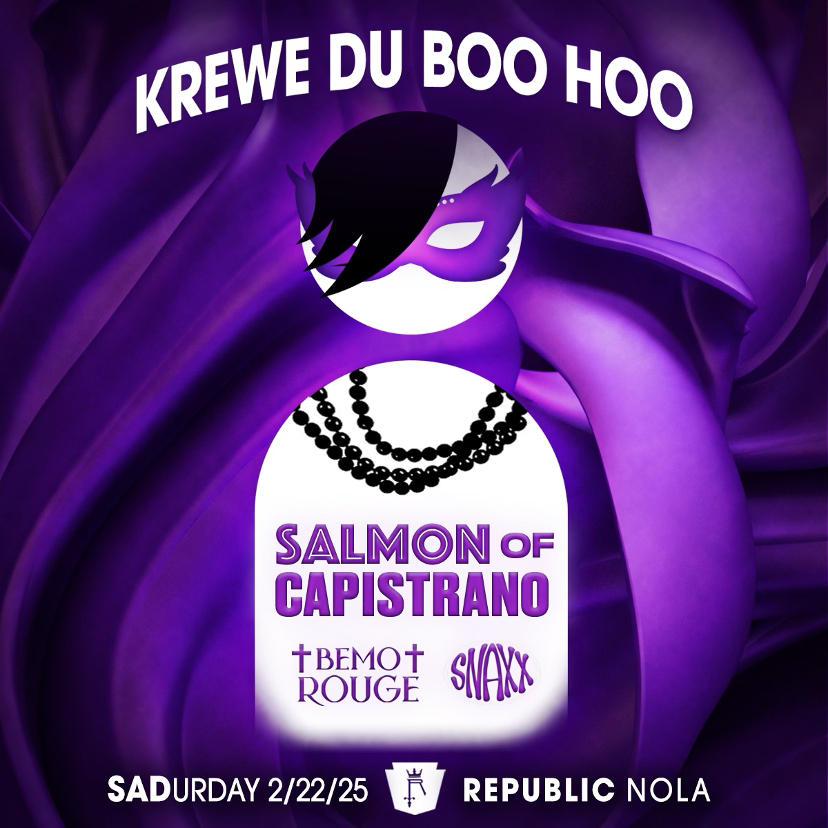 It might be Mardi Gras season... but we're still sad! Join us on SADurday 2.22 for Krewe du BOO HOO as we get a special live set from Salmon of Capistrano + your Emo King [Bemo Rouge] & Queen [SNAXX]!