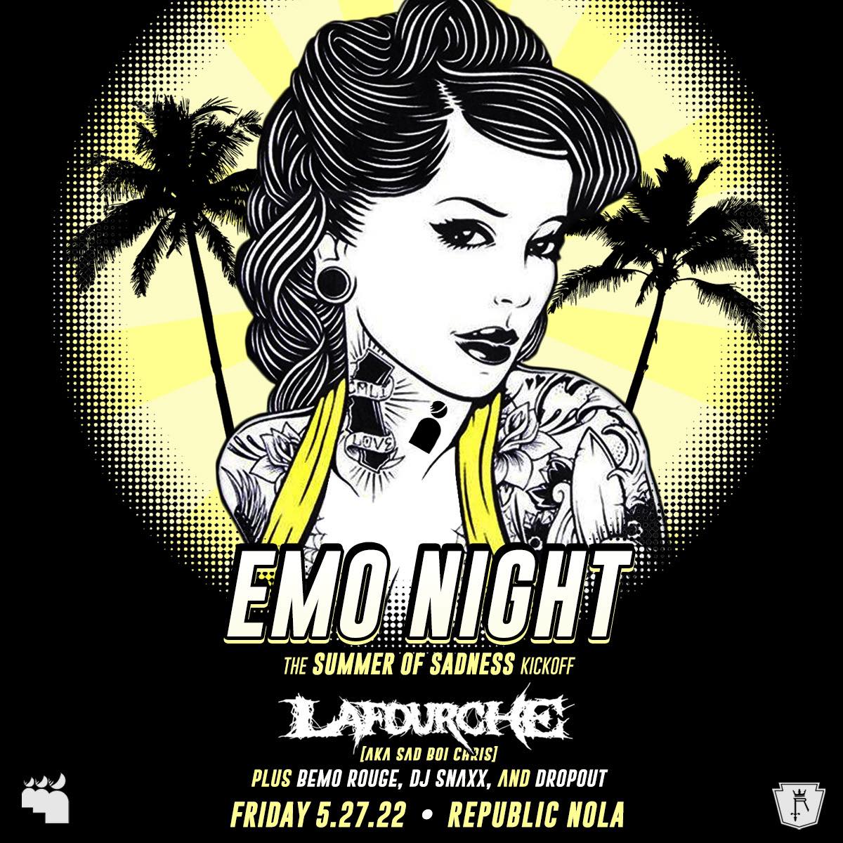 Yay, it's summer... That time of year where the sun literally tries to kill you even more than the other lukewarm seasons in Louisiana. It's 95 degrees out with 100% humidity, but is that going to stop you from wearing all black? HELL NO! Emo Night is helping you maintain your edge and aesthetic during the worst time of year to live in the south! Lafourche, Bemo Rouge, DJ Snaxx and DROPOUT are teaming up to deliver a symphony of sadness to help express those little emotions that you refuse to let go of. So come out to Emo Night and show mother nature that no matter how hot she makes it, she'll never warm up that ice box that you call a heart! Get your tickets here NOW!