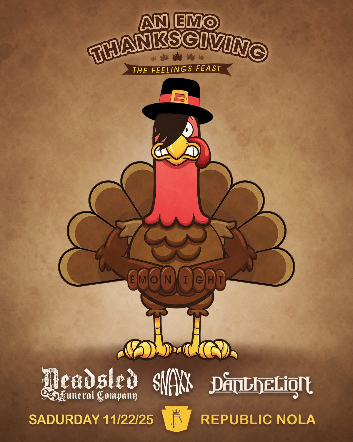 After a slam-packed advance sell out at Emo Night NOLA's 8 Year Anniversary on Halloween night, we're back with another massive holiday blowout - The 6th Annual "EMO THANKSGIVING: The Feelings Feast"with 4 massive servings of super sad singalongs from Deadsled Funeral Company, Dan The Lion, SNAXX, and Emo E on SADurday 11/22/25 at Republic NOLA! So, forget about all of your family drama this year and get all up in your feels with us instead! Eat your emotions and keep showing the world that it was never just a phase.