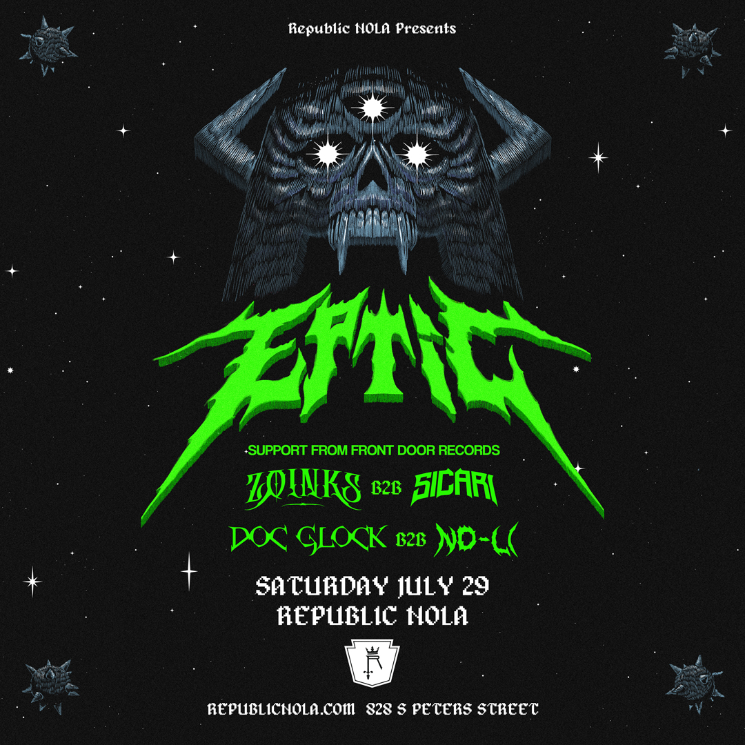 Dubstep lord Eptic is making a long-awaited return to NOLA on Saturday, July 29th with support from ZOINKS b2b Sicari and Doc Glock b2b No-Li! Get your tickets NOW!