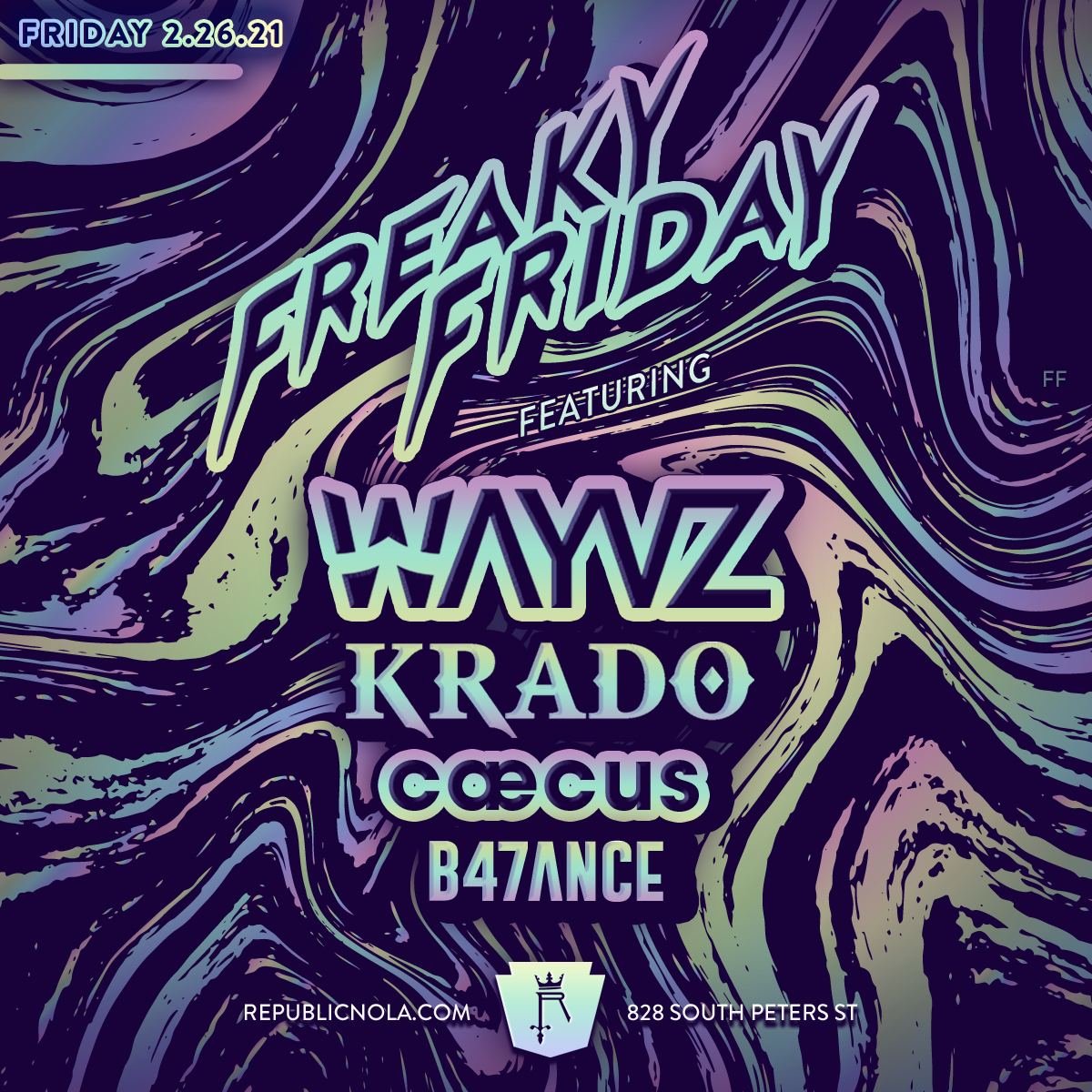 Don't miss FREAKY FRIDAY featuring Wayvz, Krado, CÆCUS, & B47ANCE on Friday 2.26.21 at Republic NOLA! Capacity is extremely limited. These shows have been selling out. Get your tickets now > https://freakyfridaywayvz.eventbrite.com