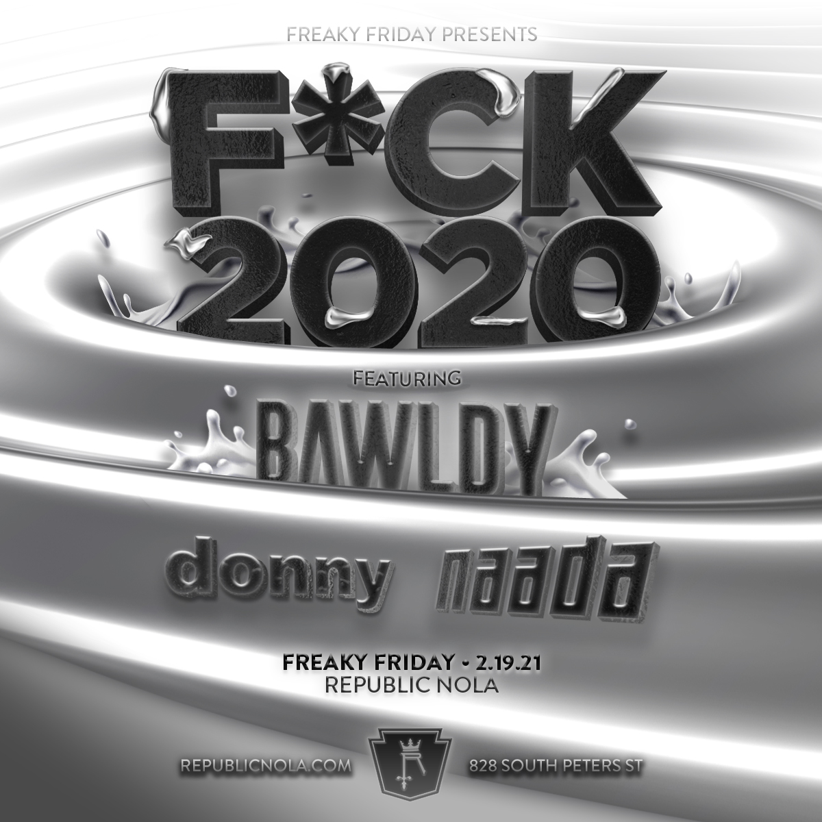 Ya know what? F*CK 2020! For Republic's first event of 2021, we finally celebrate the end of the most ridiculous year in recent history with super heavy bass sets from Bawldy, donny and naada! Because seriously, F*CK 2020!