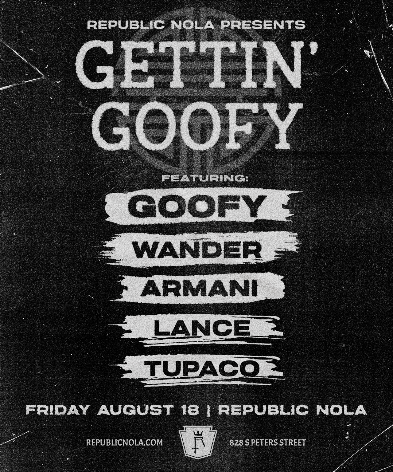We're GETTIN' GOOFY with none other than GOOFY & his crew! Join us on Friday 8.18 as Goofy, Wander, Armani, Lance, and Tupaco take the stage for one night full of ridiculously good bass, house, and dubstep! There's something for everyone with this lineup, so snag your tickets NOW!
