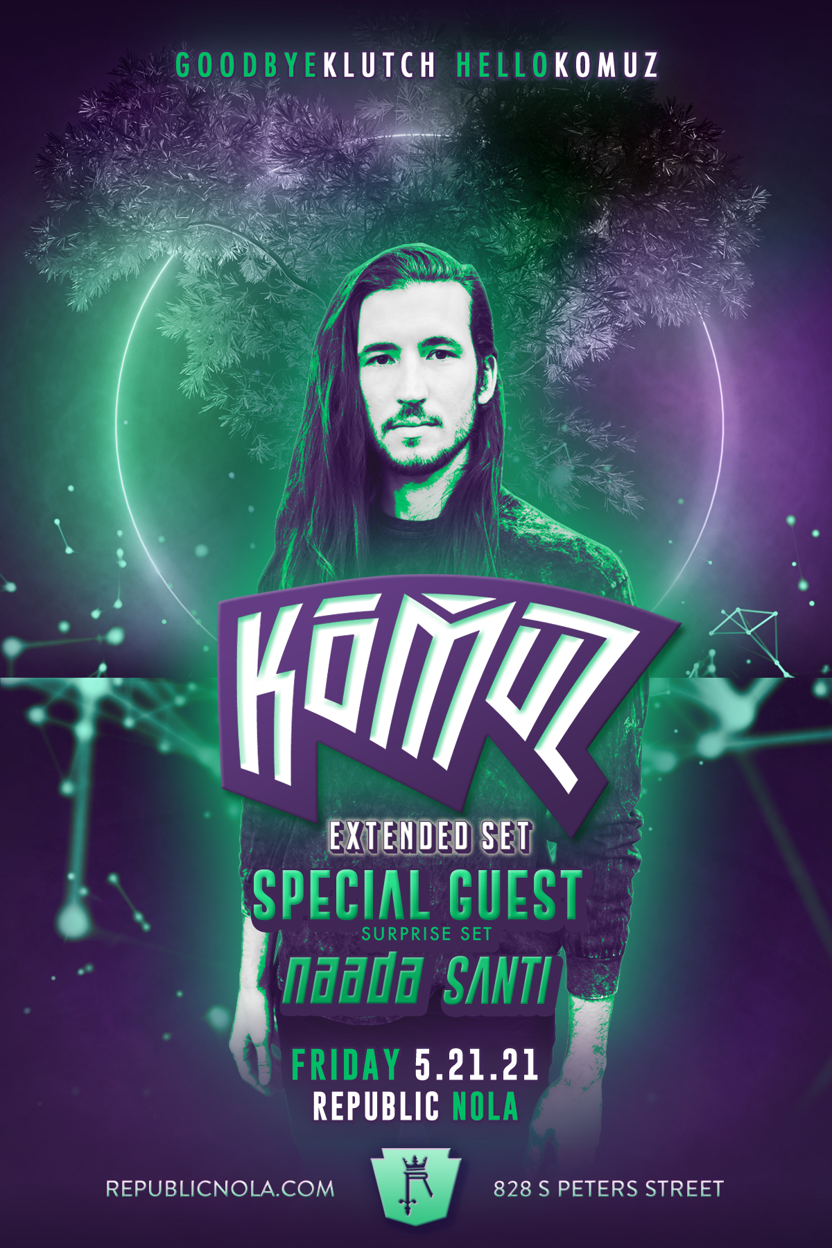 "Goodbye KLUTCH, Hello KOMUZ" with  Surprise Special Guest, Naada, and Santi on Friday 5.21.21 a Republic NOLA! Get your tickets now!