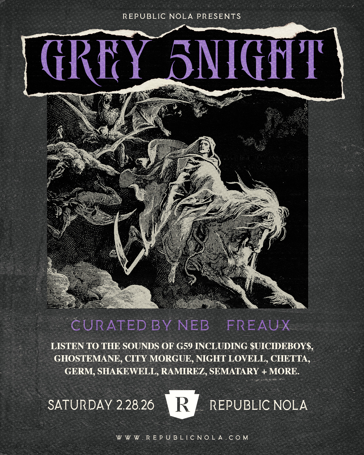 We’re running it back on SATURDAY 02.28.26; dive into the darkness with NEB + FREAUX as they curate the ultimate $UICIDEBOY$ & FRIENDS night, featuring tracks from G59, Ghostemane, City Morgue, Night Lovell, Ramirez, Shakewell, Germ, Chetta, and more! 'Are you going to see the rose in the vase or the dust on the table?' 'Either way, come dive into your new world depression.