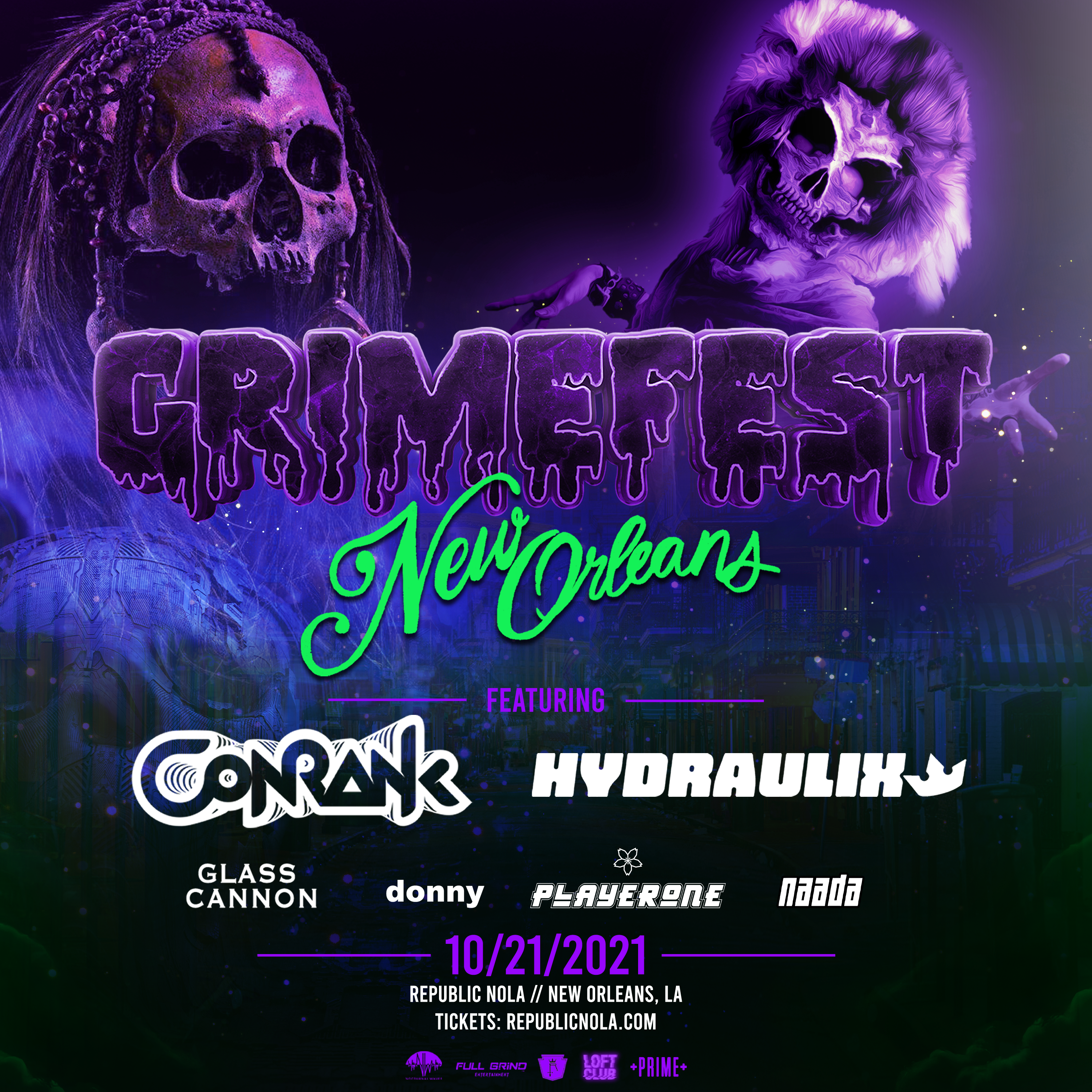 GRIMEFEST is coming to New Orleans with Conrank, Hydraulix, Glass Cannon, donny, Playerone, and naada on Thursday, October 21! Get your tickets NOW!