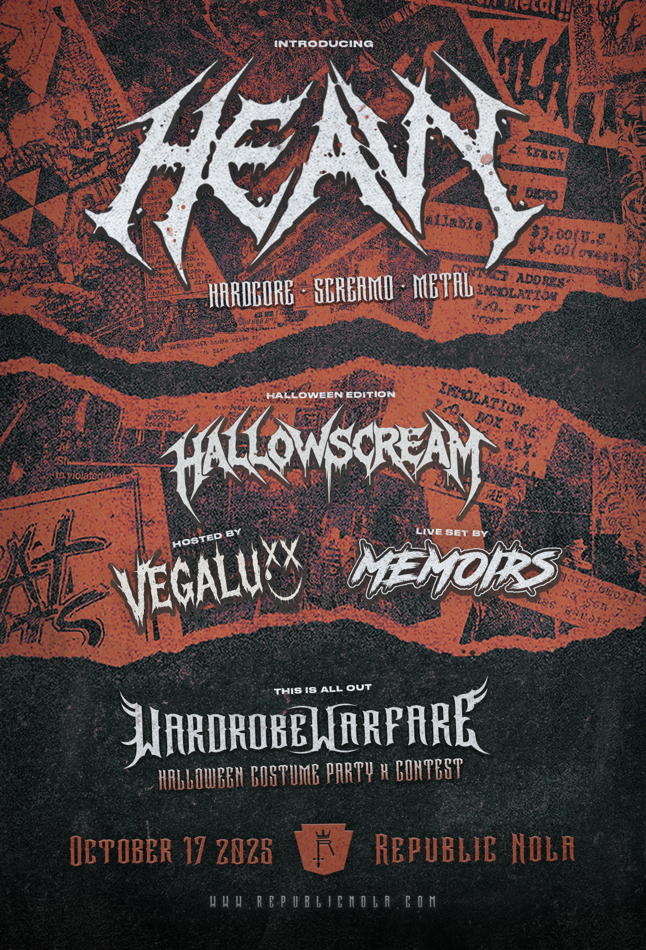 Introducing HEAVY: A new series featuring the best of Hardcore, Metal, Nu-Metal, and Screamo curated by VEGALUXX! The pit opens up on FRIDAY 10.17.25 with HEAVY: HallowSCREAM featuring a live set by MEMOIRS covering all the HEAVY hitters followed by a high-speed, full-throttle, distortion-drenched night of absolute chaos for the headbangers and mosh pit vets. This isn’t your standard costume party - this is absolutely wardrobe warfare. Winner will be hand selected by Vegaluxx and receive the HallowSCREAM SLASHER SKULL and drink free all night! Get ready for a night of masked mayhem on 10/17 at Republic NOLA!