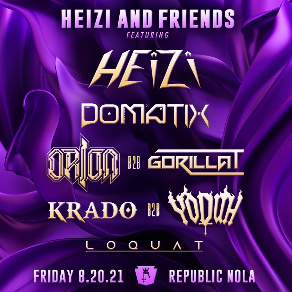 Don't miss the first ever HEIZI and Friends featuring HEIZI, Domatix, Orion b2b Gorilla T, Krado b2b Yoduh, and Loquat on Friday, August 20th!