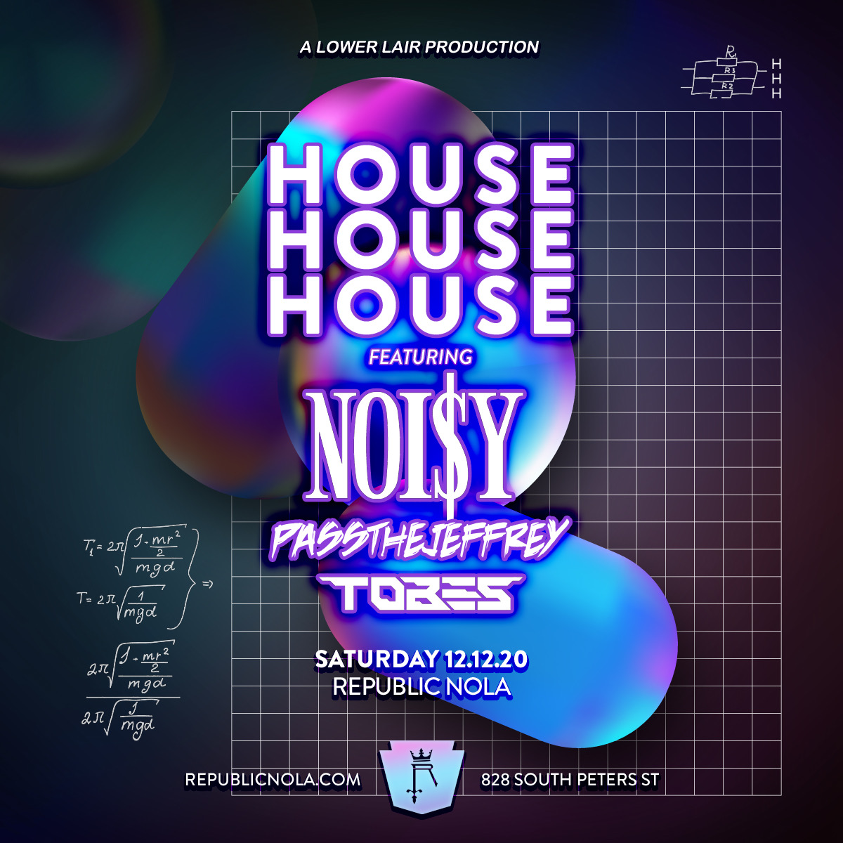 WELCOME TO OUR HOUSE... HOUSE HOUSE! NOI$Y, PassTheJeffery, and Tobes are filling your soul with high energy house music on 12/12!