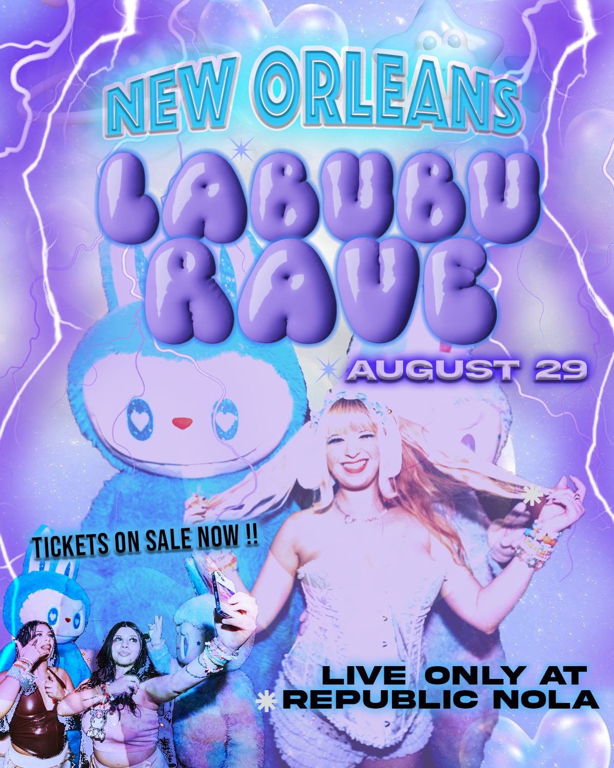 Kitty's LABUBU Rave is a themed dance party experience blending the whimsical and cute aesthetic of the beloved characters with the high-energy and vibrant atmosphere of a rave, featuring techno and tech house music and interactive elements Live only at Republic NOLA where everyone is encouraged to dress in LABUBU gear!