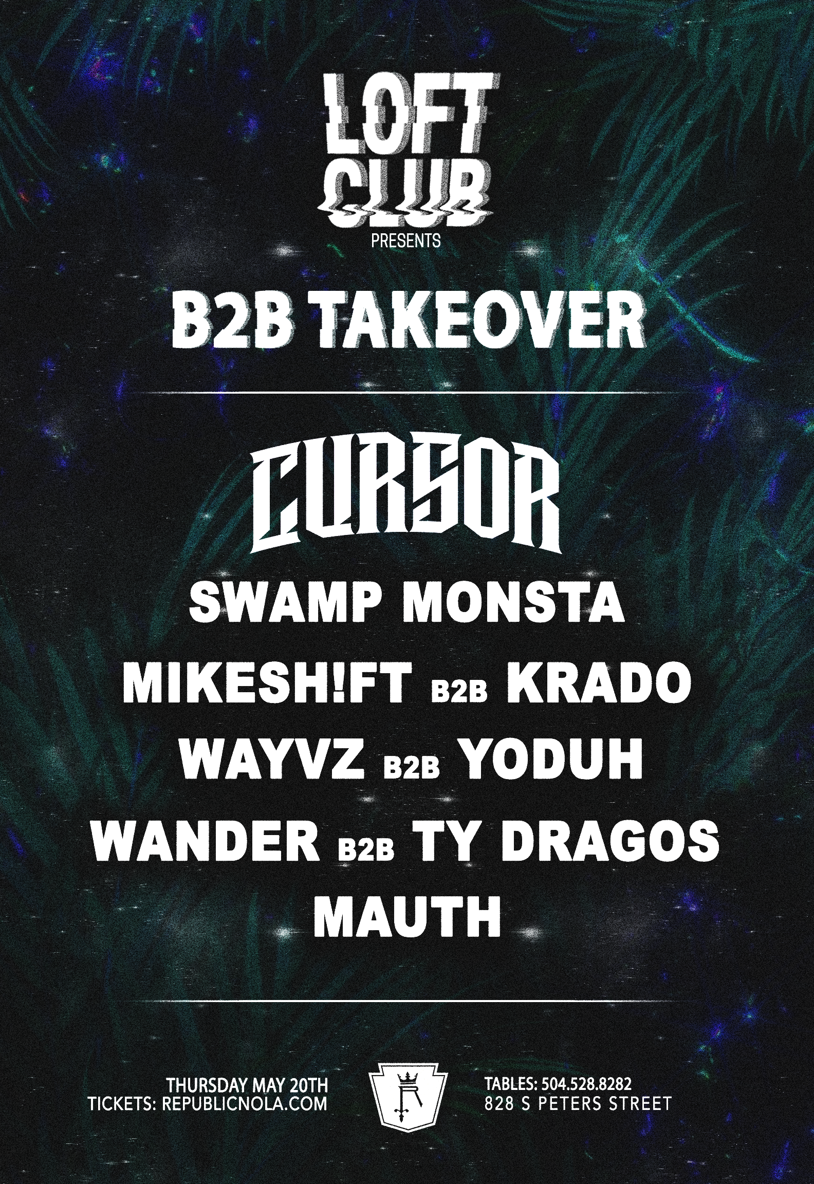 LOFT CLUB: B2B TAKEOVER ft CURSOR, SWAMP MONSTA, MIKESH!FT b2b KRADO, WAYVZ b2b YODUH, WANDER b2b TY DRAGOS, MAUTH on Thu 5/20! Get your tickets now!