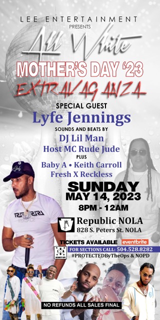 Lee Entertainment Presents All White Mother's Day Extravaganza '23 featuring special guest Lyfe Jennings + sounds and beats by DJ Lil Man, Host MC Rude Jude plus Baby A, Keith Carroll, & Fresh x Reckless on Sunday, May 14th! GET YOUR TICKETS NOW!