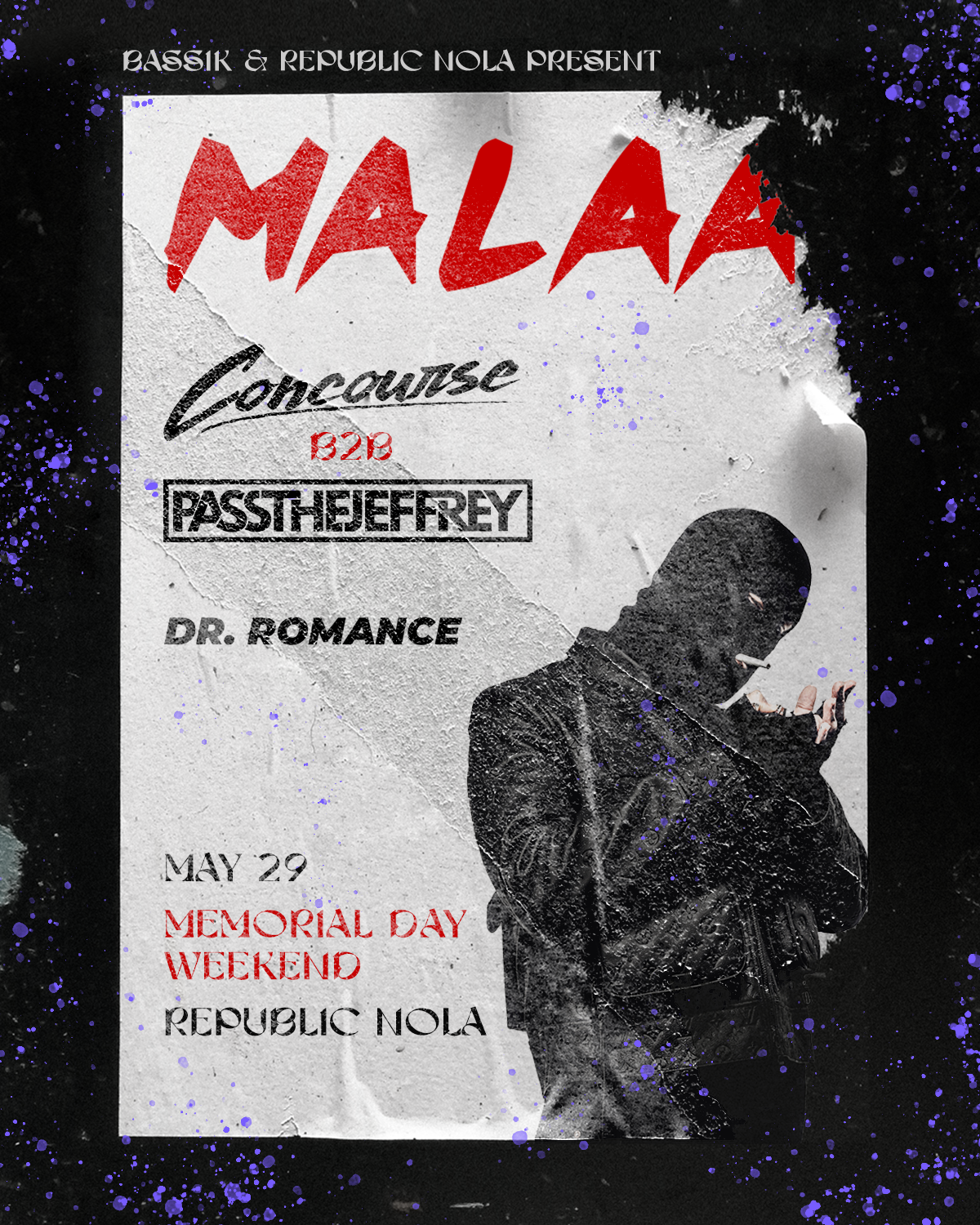 House legend Malaa will be here on Sunday, May 29th with Concourse B2B PassTheJeffrey and Dr. Romance!