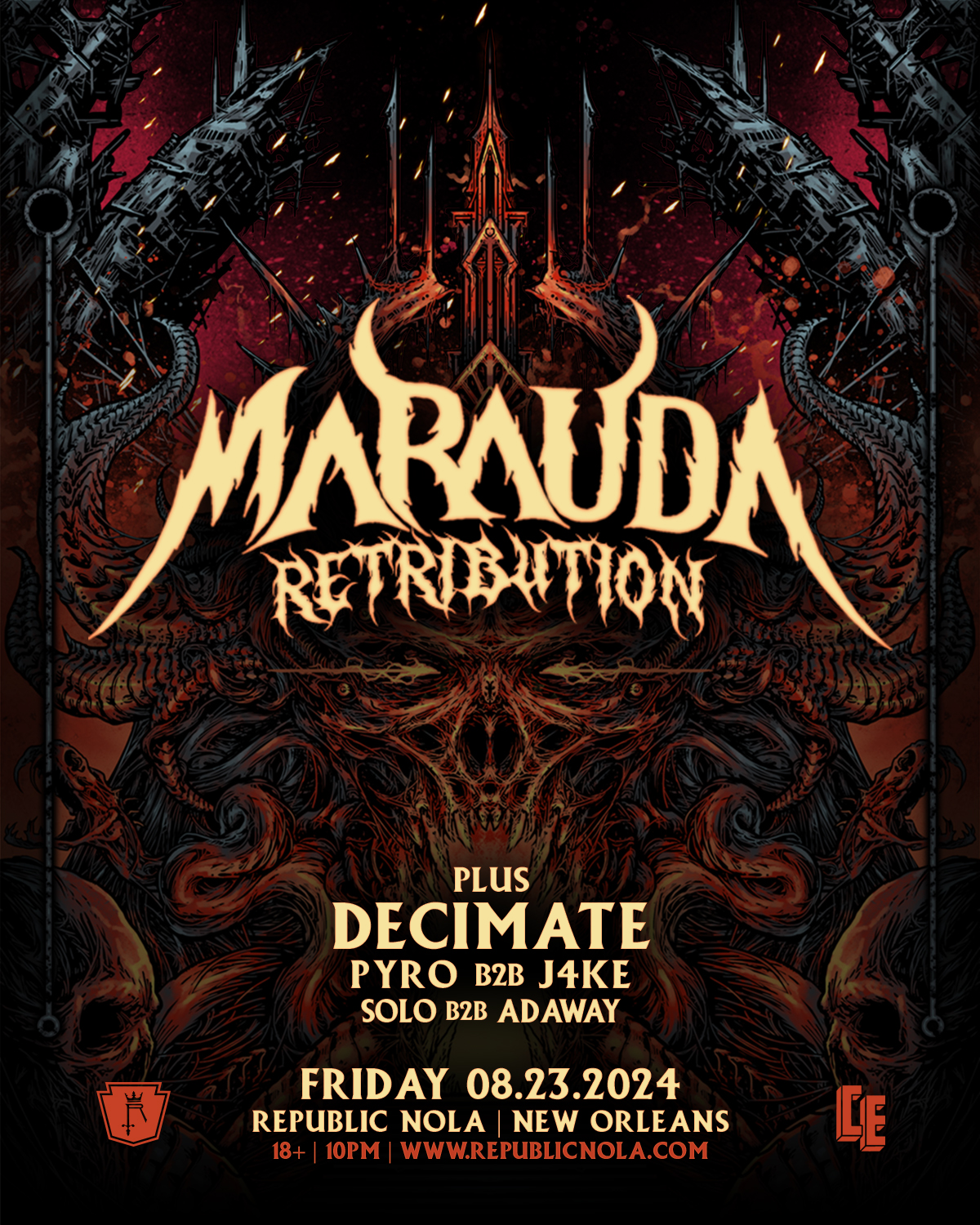 MARAUDA: RETRIBUTION TOUR ft. Decimate + support from Pyro b2b J4ke & Solo b2b Adaway on Friday 8.23!