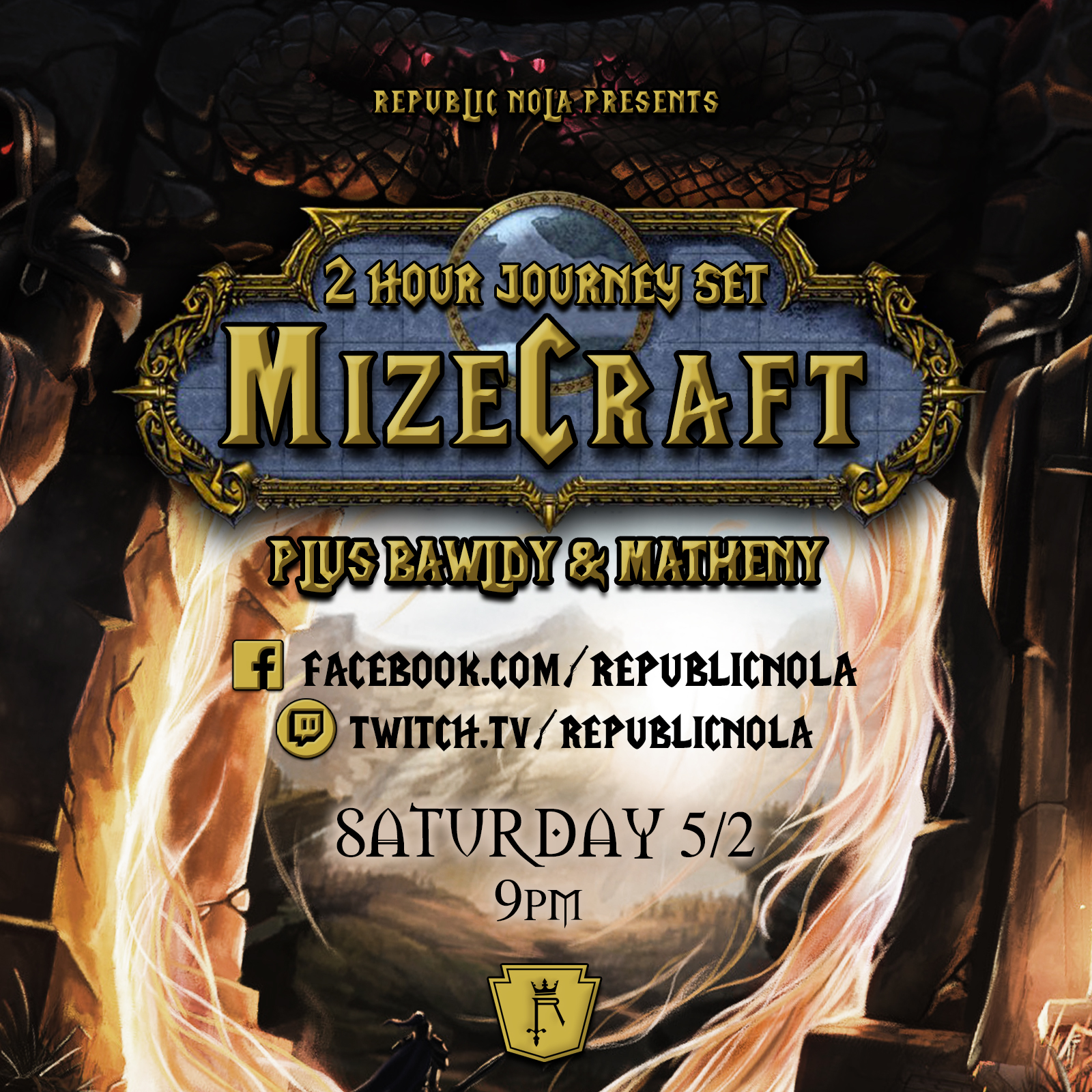 Greetings adventurer! Are you ready to go on a quest through time and space with your raid leader, Mize! He is taking you on an EPIC 2-hour journey through sound, but not before you're greeted with sounds from bàwldy and Matheny Music! It all begins on Saturday 5/2 at 9 pm on Facebook live & Twitch. Make sure you gather all materials and potions you may need because you're in for the virtual concert experience of a lifetime!