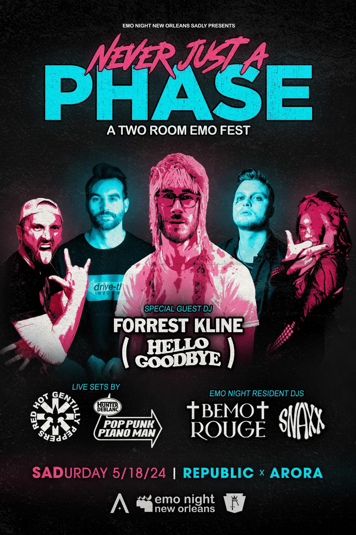 Emo Night NOLA presents Never Just a Phase: A Two Room Emo Fest featuring special guest DJ Forrest Kline of Hellogoodbye + live set + Red Hot Gentilly Peppers + DJ Sets from your Emo King Bemo Rouge & Queen SNAXX in Republic! PLUS we have Pop Punk Piano Man Hunter deBlanc will be giving us a live set in ARORA! Don't miss this one-of-a-kind experience and snag your tickets now for just $6.66!
