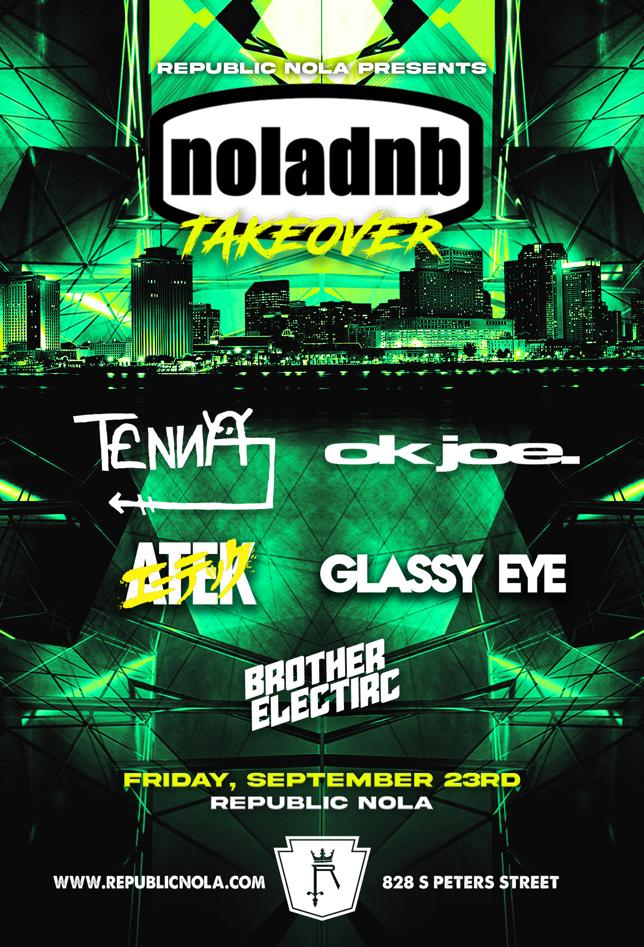 Presenting to you some of the best DNB the city has to offer with Tenna, okjoe. Atek, Glassy Eye, Brother Electric for Republic NOLA's first NOLADNB Takeover on Friday, September 23! Get your tickets NOW!