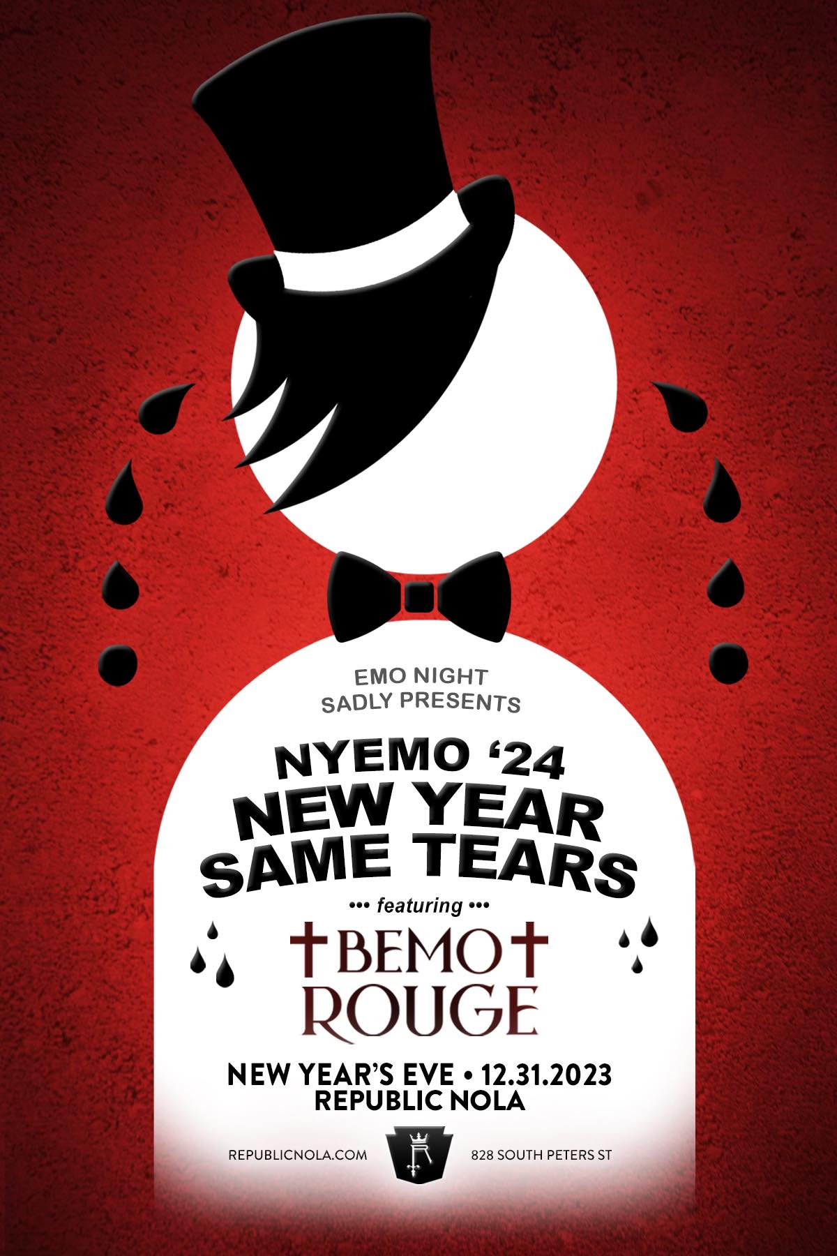 Well guys... this year sucked. And it may just get worse. So, come bring in 2024 with your emo family for a sliver of happiness for NYEmo: New Year, Same Tears! Your Emo King Bemo Rouge will be giving you a special extended set to ring in the not so happy new year.