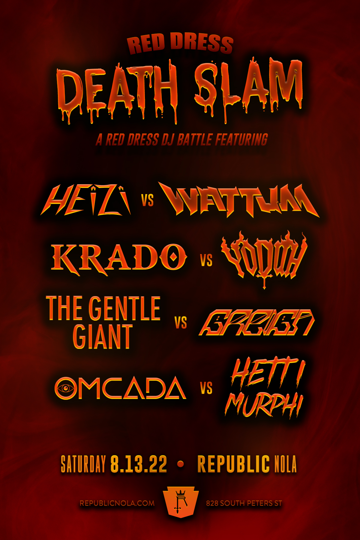 Prepare for the ULTIMATE versus battle between Heizi vs. Wattum, Krado vs. Yoduh, The Gentle Giant vs. Greign, and Omcada vs. Hetti Murphi! These DJs are going to be battling it out TO THE DEATH to win your red heart over with the first ever Red Dress Death Slam on Saturday, August 13th! If you're wearing a red dress - enjoy free bubbles from 9-10PM! If you're in a red dress OR red PJs - enjoy $5 wells until 11PM! IT'S. THE. RED. DRESS. DEATH. SLAM!!!