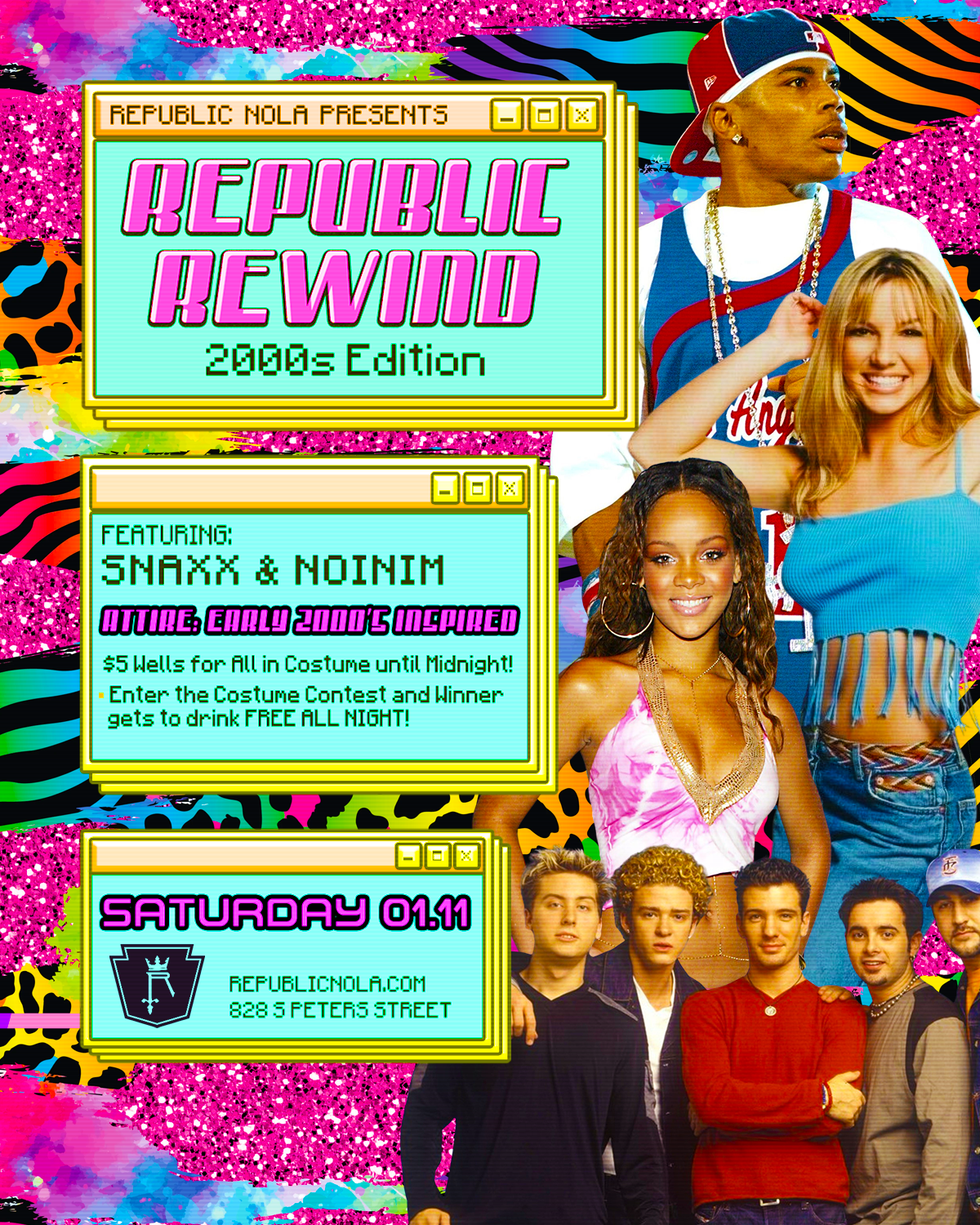 It’s the 2000’s. You're watching TRL on MTV while you’re bedazzling a pair of jeans in your room that’s covered in Britney Spears and *NSYNC posters. Life is good, but you know what's better!? Dusting off those denim jackets and trucker hats, putting up your AIM away message, grabbing your bling and flip phone... and JOIN US FOR REWIND: 2000’s Edition featuring SNAXX & NOINIM! A nostalgic night where we're throwing it back on Saturday 01.11 to remember the beginning of the millennium / the infamous Y2K. We'll be blasting your favorite jams from the 2000s, because frankly... "that's hot!"