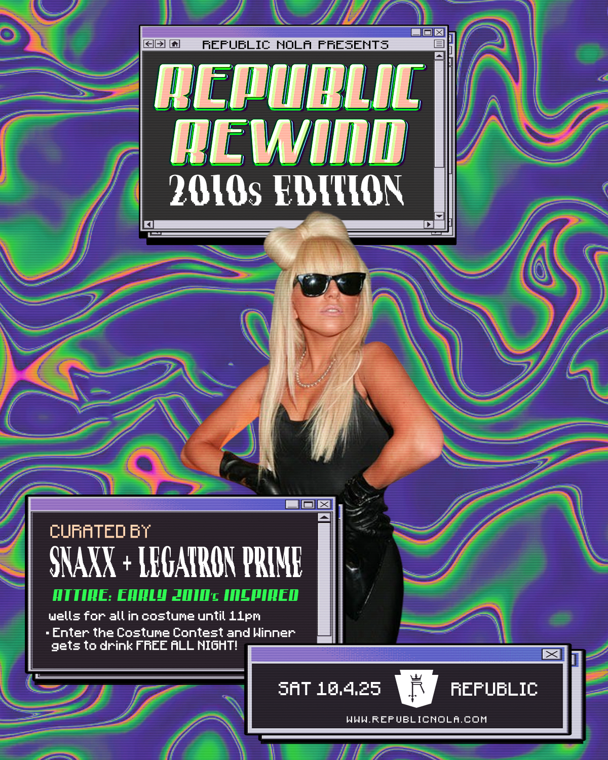 We’re taking you back to the decade that gave us viral dance crazes, peak Tumblr culture, and some of the biggest pop and rap anthems of all time — it’s Rewind: 2010’s Edition on SATURDAY 10.04.25 at Republic NOLA!