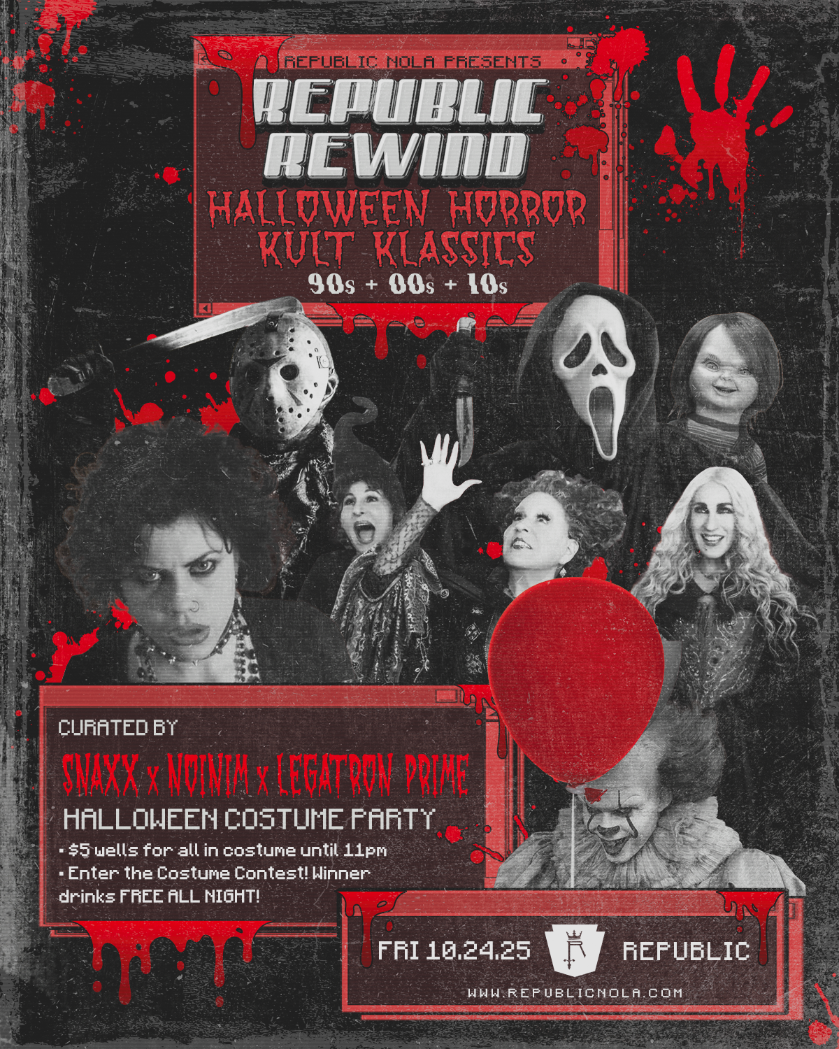 CALLING ALL FINAL GIRLS, GHOSTS, AND GHOULS OF THE 1990s, 2000s, and 2010s — Join us for REWIND: HALLOWEEN HORROR KULT KLASSICS edition on FRIDAY, 10.24! Relive the golden age of teen slasher films on the big screen with all the best clips from “Scream” and “Hocus Pocus” to “It” and “Chucky”! All while screaming along to the biggest bangers of the 90s, 00s, and 10s curated by SNAXX, NOINIM, and LEGATRON PRIME - expect “Toxic” by Britney, “Thriller” flashbacks, and pop hits so good they’ll haunt you forever. Come dressed to slay (literally) for $5 wells until 11PM and enter the retro halloween costume contest for a shot at FREE drinks all night. Don’t ghost this one — it’s going to be bloody iconic!