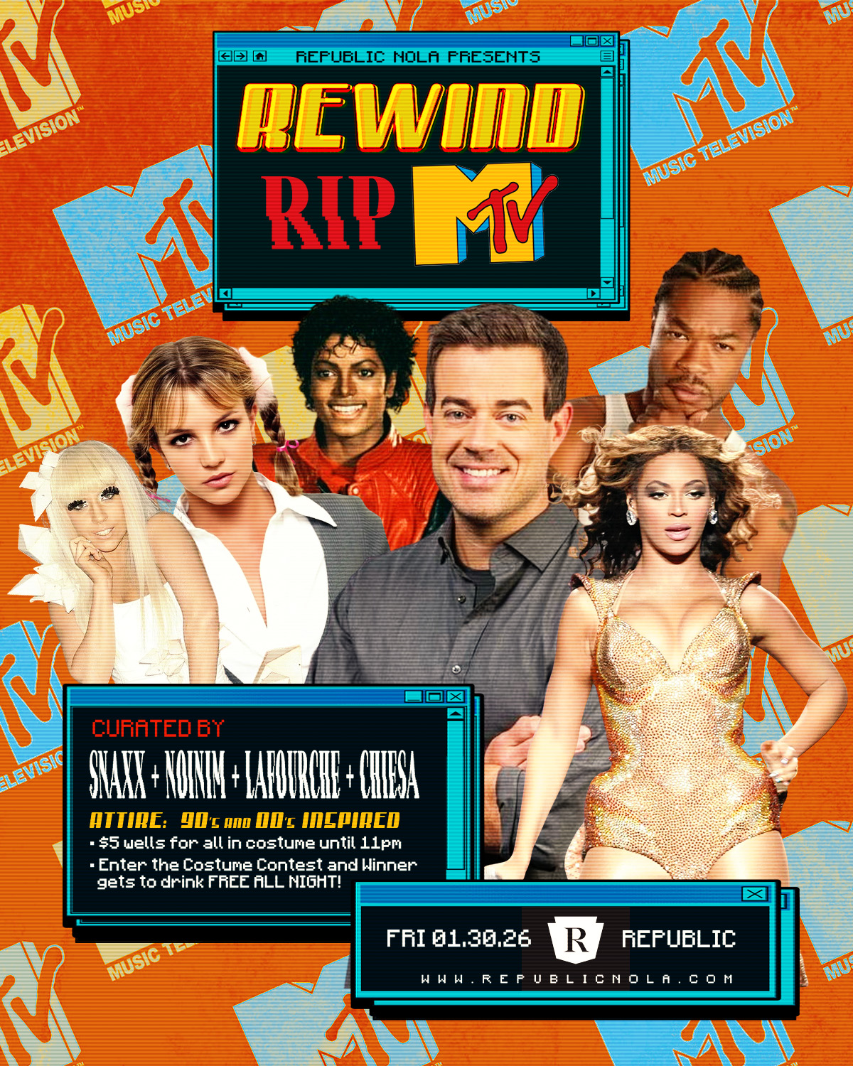 We're sending off MTV to valhalla the only way we know how to, a crazy ass dance party blending together EVERY era of the ICON of Music Television on Friday 01.30.26 with SNAXX + NOINIM + Lafourche + Chiesa!