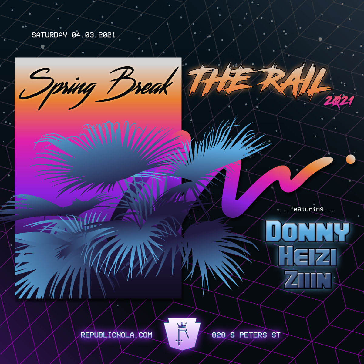 It's that time of the year.... get 1983 Miami Beach Spring Break RATCHET at Spring BREAK THE RAIL 2021 featuring Donny, Heizi, & Ziiin on Saturday 04.03.21 at Republic NOLA! OK OK OK, we would LOVE it if you'd come break the rail. Honestly, nothing would make us feel more like we're back to normal. But, until the city changes the guidelines, we just can't allow y'all to ride the rail. Spring BREAK THE RAIL in your beautiful little hearts while Donny, Heizi, & Ziiin absolutely crush their nastiest, heaviest bass sets to date!