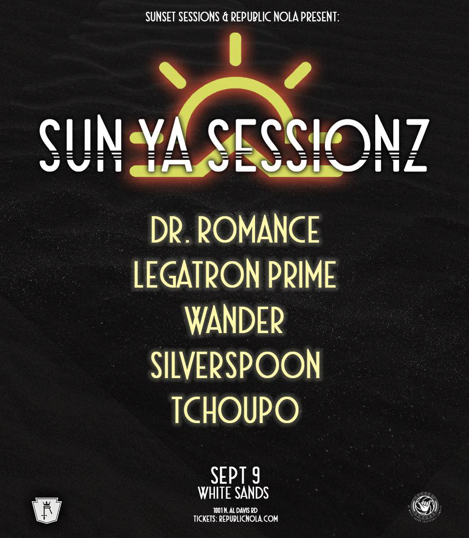 Republic NOLA & Sunset Sessions have joined together to bring you a one-of-a-kind experience, featuring some of NOLA's hottest locals -- Dr.Romance, Legatron Prime, Wander, Silverspoon, Tchoupo + MORE on Saturday 9.9 at White Sands Beach Volleyball Complex!