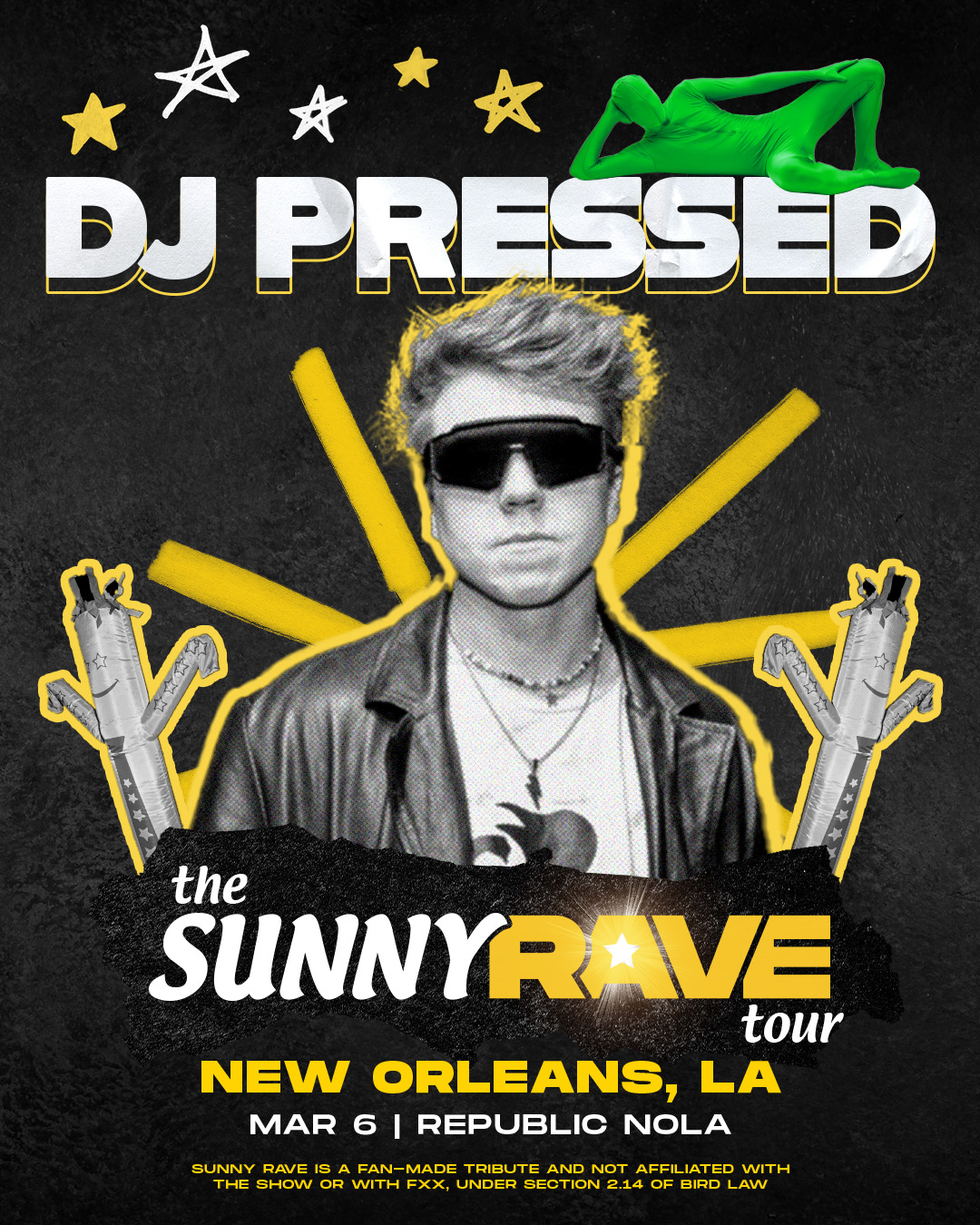 Can I offer you a nice rave in this tryin' time? For the first time ever, dj pressed is bringing SUNNY RAVE to the Big Easy, a wild audiovisual rave experience celebrating Always Sunny in Philadelphia. Watch your serotonin fly high as a crow! ????