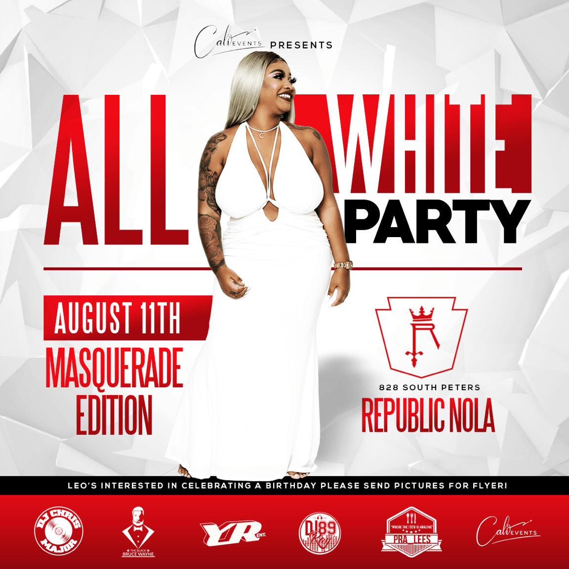 The All White Party: Masquerade Edition powered by Cali Events is making it's way to Republic NOLA on 8/11/19! Grab your tickets now for one of most anticipated parties this summer!