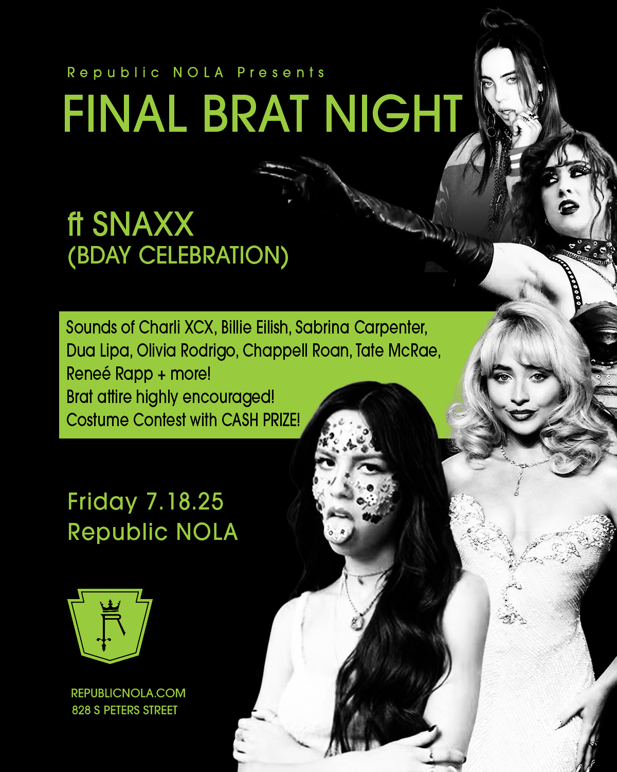 Goodbye forever brat summer! It's time for one final BRAT NIGHT, and we're going out with a BANG! It's also the birthday of your Brat Night DJ and host, SNAXX, so let's celebrate with all the lady-led ‘Club classics' by Charli xcx, Tate McRae, Sabrina Carpenter, Billie Eiiish, Chappell Roan, and many more! We wanna see you go ALL OUT for the very last BRAT NIGHT costume contest, and who knows... you might win a CASH PRIZE! BRAT's '15 Minutes' might be over, but 'it's okay we're okay', we promise