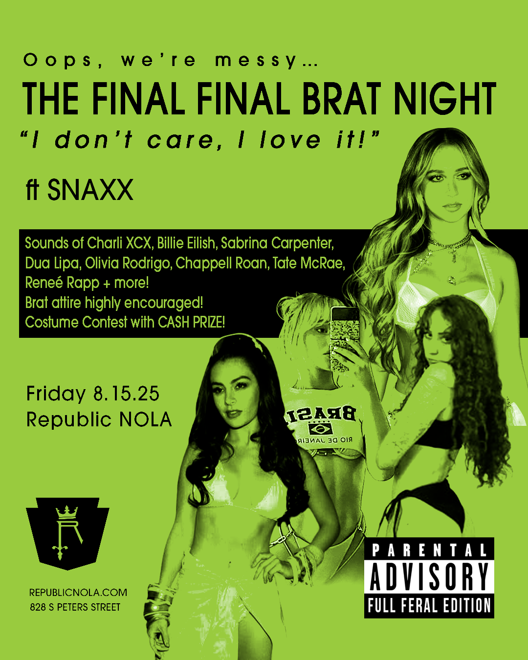 Oops… we’re messy! You thought we were done? Babe. We’re brats, not quitters. Just like Charli, we can't let go of brat summer! After nearly 100 DMs asking for one more, it’s clear you can’t either — so, we’re bringing you THE FINAL FINAL BRAT NIGHT for one last pouty, petty, feral farewell — a full beatdown of bratcore chaos featuring the sounds of Charli XCX, Billie Eilish, Sabrina Carpenter, Dua Lipa, Olivia Rodrigo, Chappell Roan, Tate McRae, Reneé Rapp + more curated by SNAXX! We’re bringing that bimbo rage & that delulu energy back on FRIDAY 8.15.25! Don’t miss the most unbothered, unhinged night of your life! We don’t care — we love it!