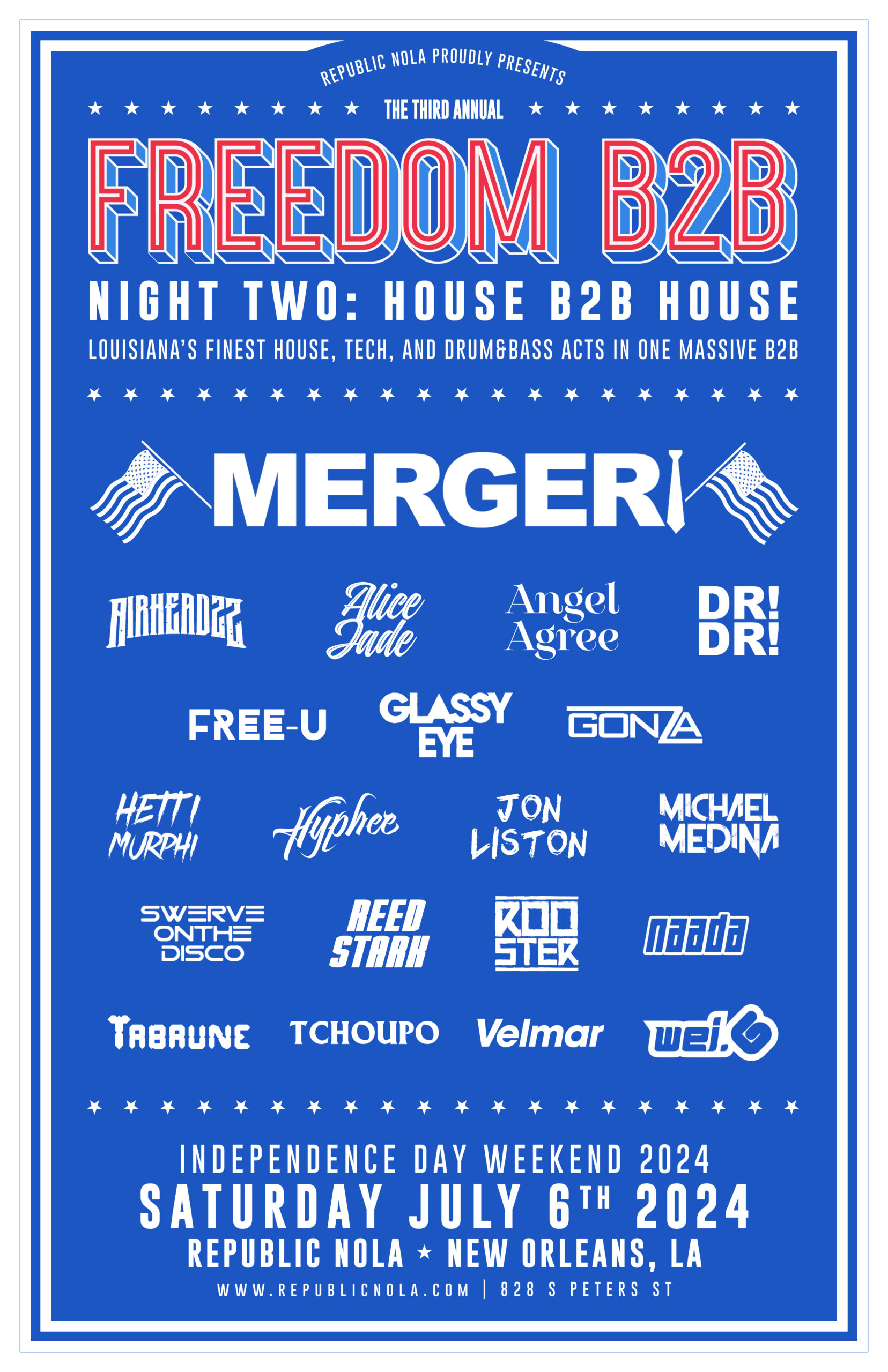 THE THIRD ANNUAL "FREEDOM B2B" is BACK and we’re going BIGGER than ever! This year’s massive event featuring 40+ of our best locals will be TWO DAYS - Bass/Dubstep/Riddim on Friday 7.5 & House/Techno/Drum & Bass on Saturday 7.6! We’re getting to celebrate our collective freedom! on Independence Weekend with an INDEPEN-DANCE FEST!