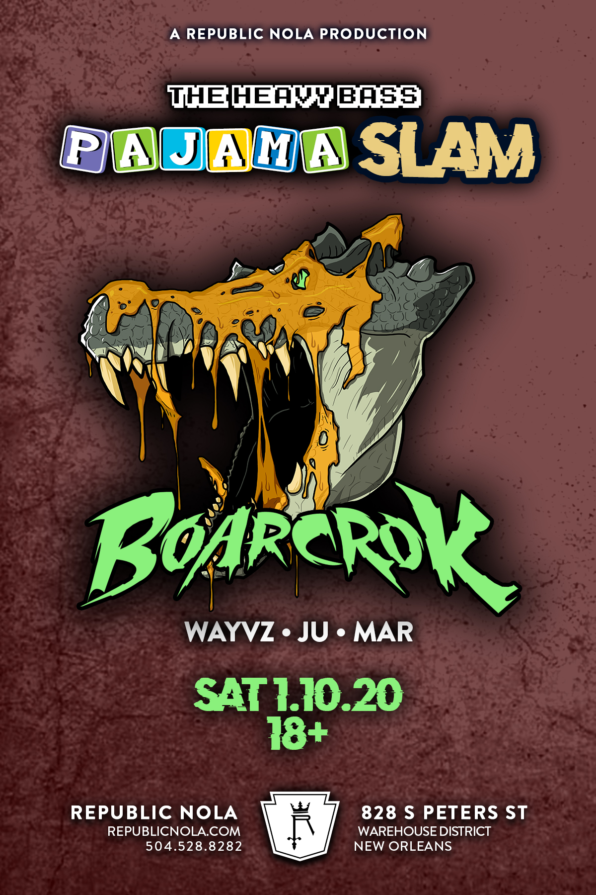The first Pajama Slam of 2020 is HERE and we're ready to THROW DOWN with Certified Swamp Monster BOARCROK, with support from WAYVZ, Ju, and Mar! Go absolutely insane on the rail while swaddled in the comfort of your own pajamas at New Orleans' biggest and best cozy rave!