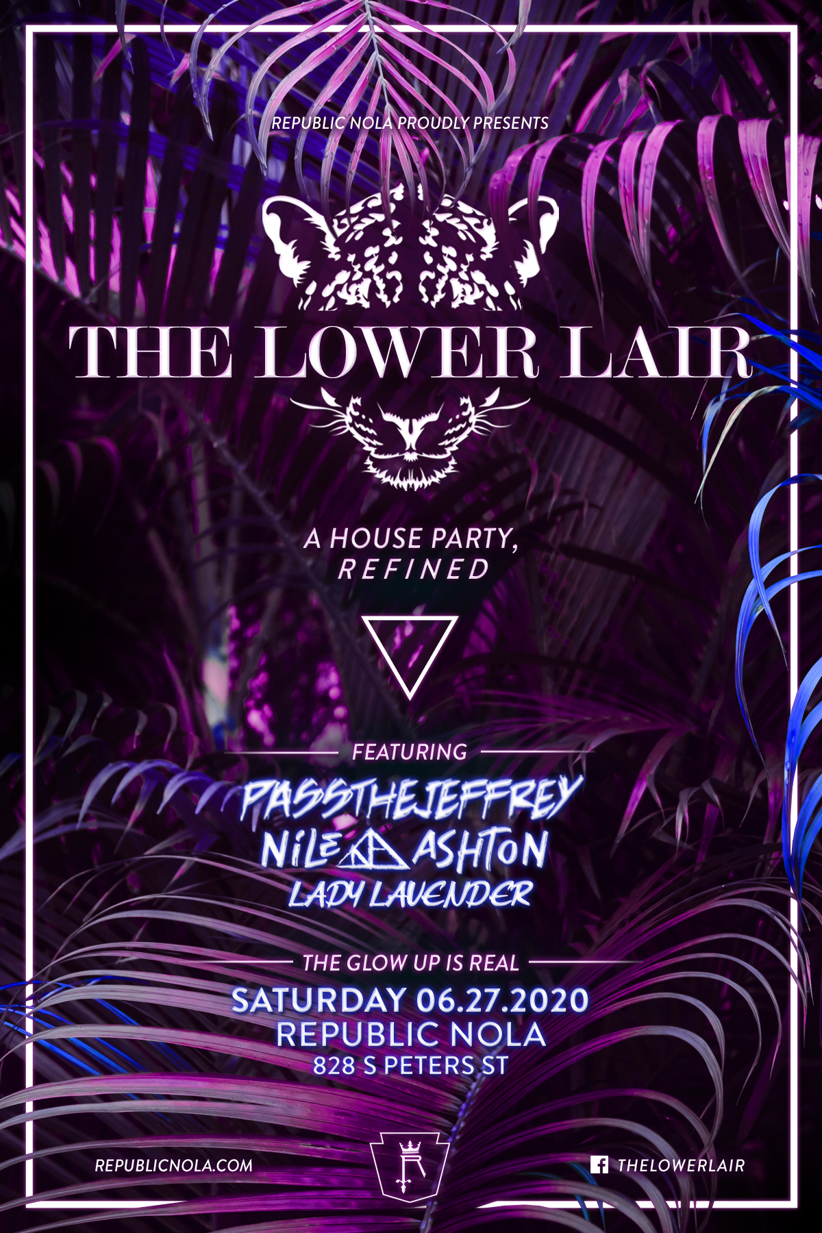 Journey into the wilds of The Lower Lair with us on Saturday 6.27.20 to experience the vibrant sights & sounds of New Orleans' premier lounge-style house-party! PassTheJeffrey, Nile Ashton, and Lady Lavender will be on the decks to make sure the vibes are just right all night with an intoxicating mix of house & top 40s to get your heartbeat racing.