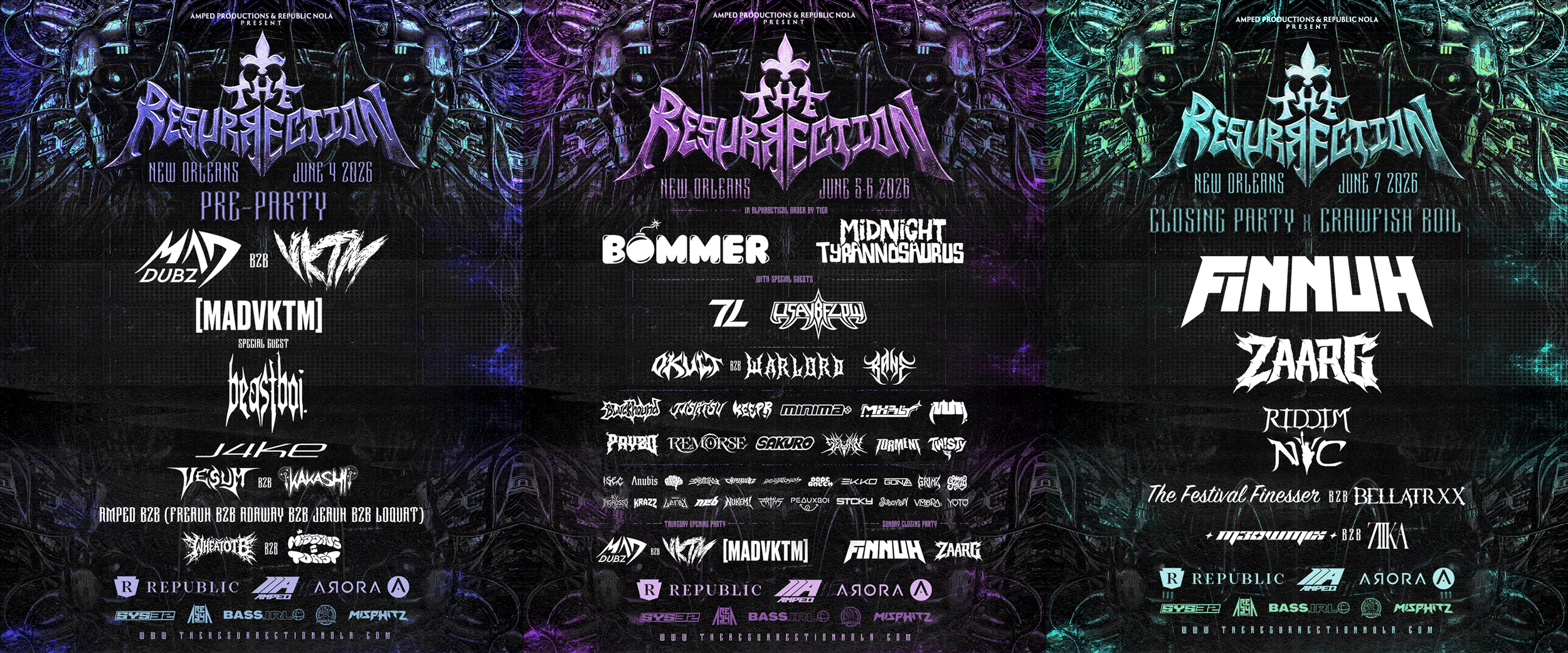 RIDDIM takes over NOLA with THE RESURRECTION, a 4 day, 3 venue riddim + dubstep festival featuring Midnight T, Bommer, and many more this June 4-7, 2026! The festival is Friday 6/5 and Saturday 6/6 with an opening party on Thursday 6/4 with MAD DUBZ b2b VKTM (MADVKTM) + Beastboi and a closing party + crawfish boil on Sunday 6/7 with Finnuh + Zaarg! All shows take place at REPUBLIC NOLA, ARORA NOLA, and THE WHY NOT RIDDIM BUS! Schedule by day and venue coming soon!