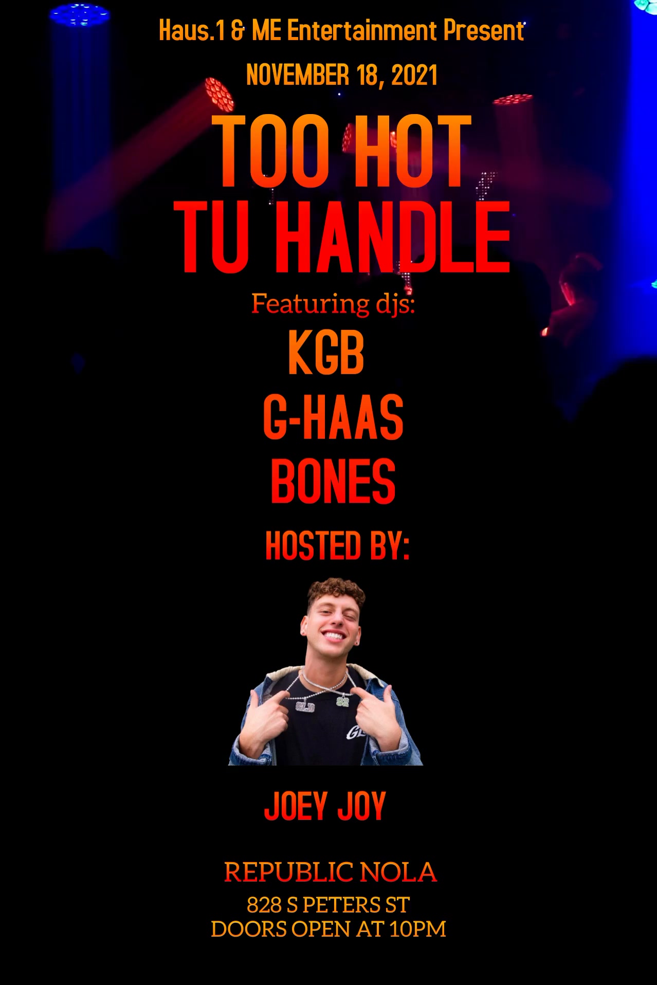 Haus.1 and ME Entertainment Present: TOO HOT TU HANDLE.. hosted by season 2 star JOEY JOY! The weather may be getting a bit cold, but the night is going to be HOT. So come ready to go and let's show Joey why New Orleans is the number ONE party destination in the world. 10pm doors, we will see you there to hear sounds by KGB, G-HAAS, and BONES...