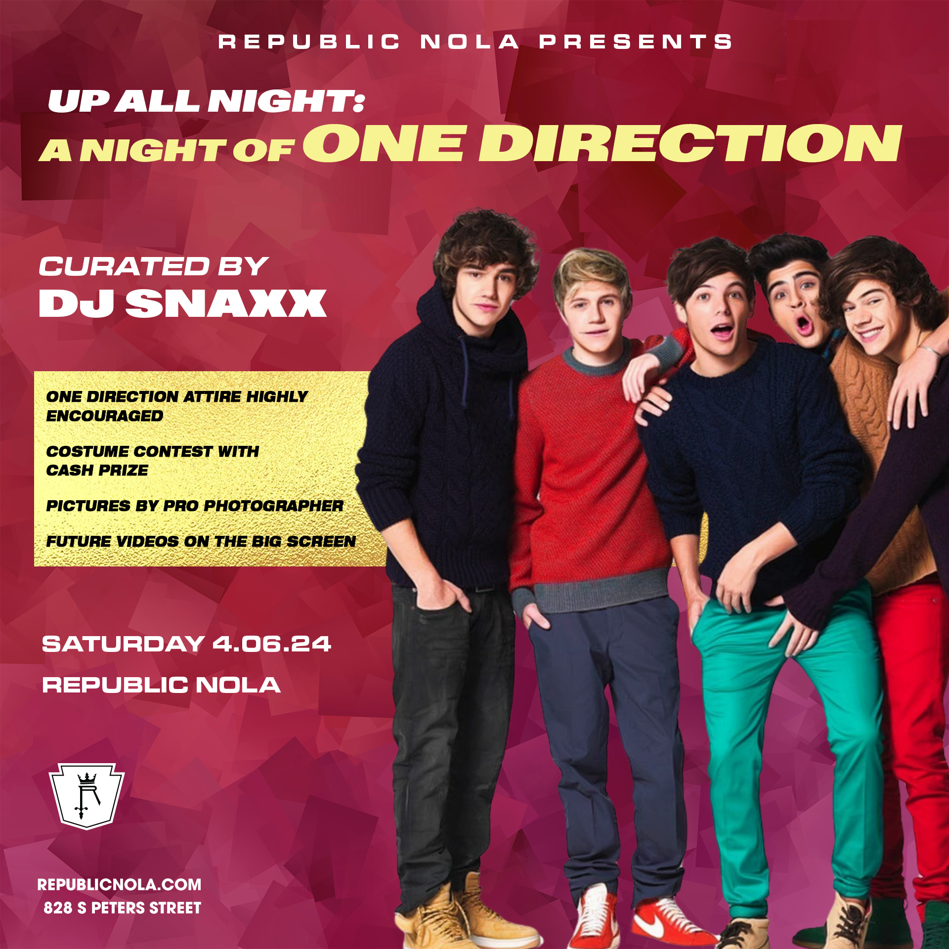 Like getting together with all your friends for Up All Night: A Night of One Direction curated by DJ SNAXX on Saturday 4.6! That's right, we're getting down to the sounds of your favorite boy band and 'One Way or Another', we're going to make some 'Midnight Memories'! Dress up like someone from One Direction or in your favorite fan gear to take the 'Perfect' picture and enter in our COSTUME CONTEST for a CASH PRIZE! Because 'Through the Dark'... 1D is 'Still the One'!